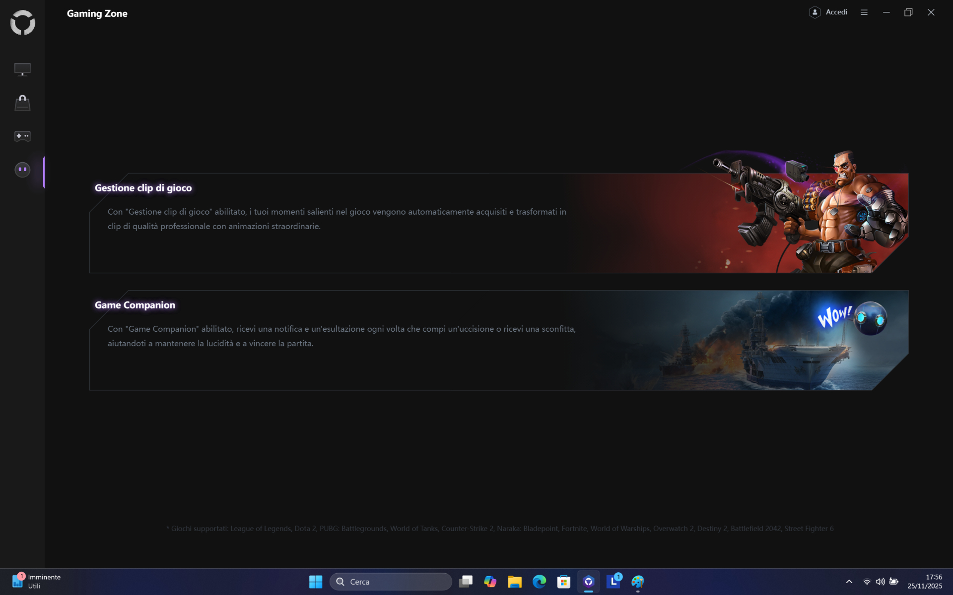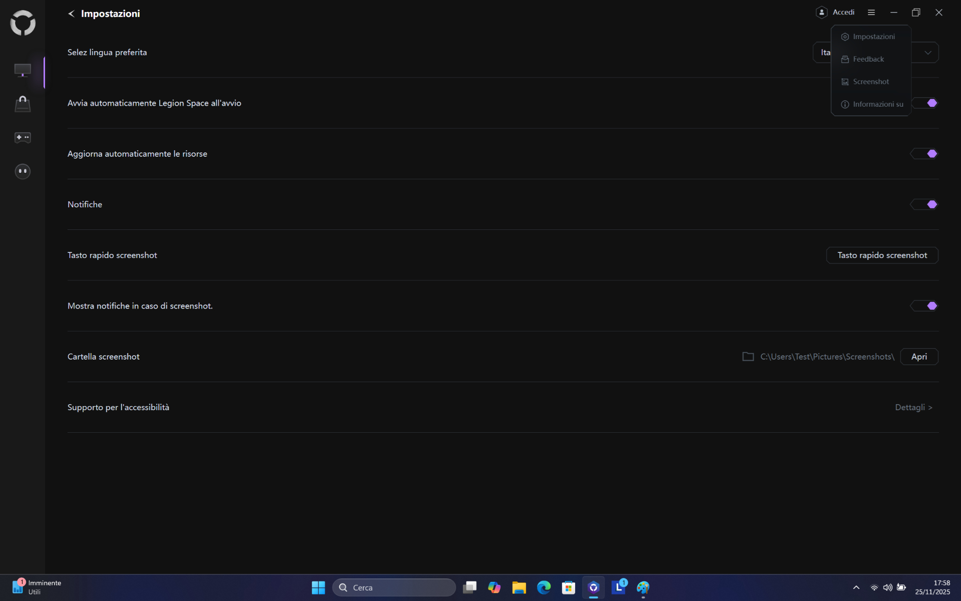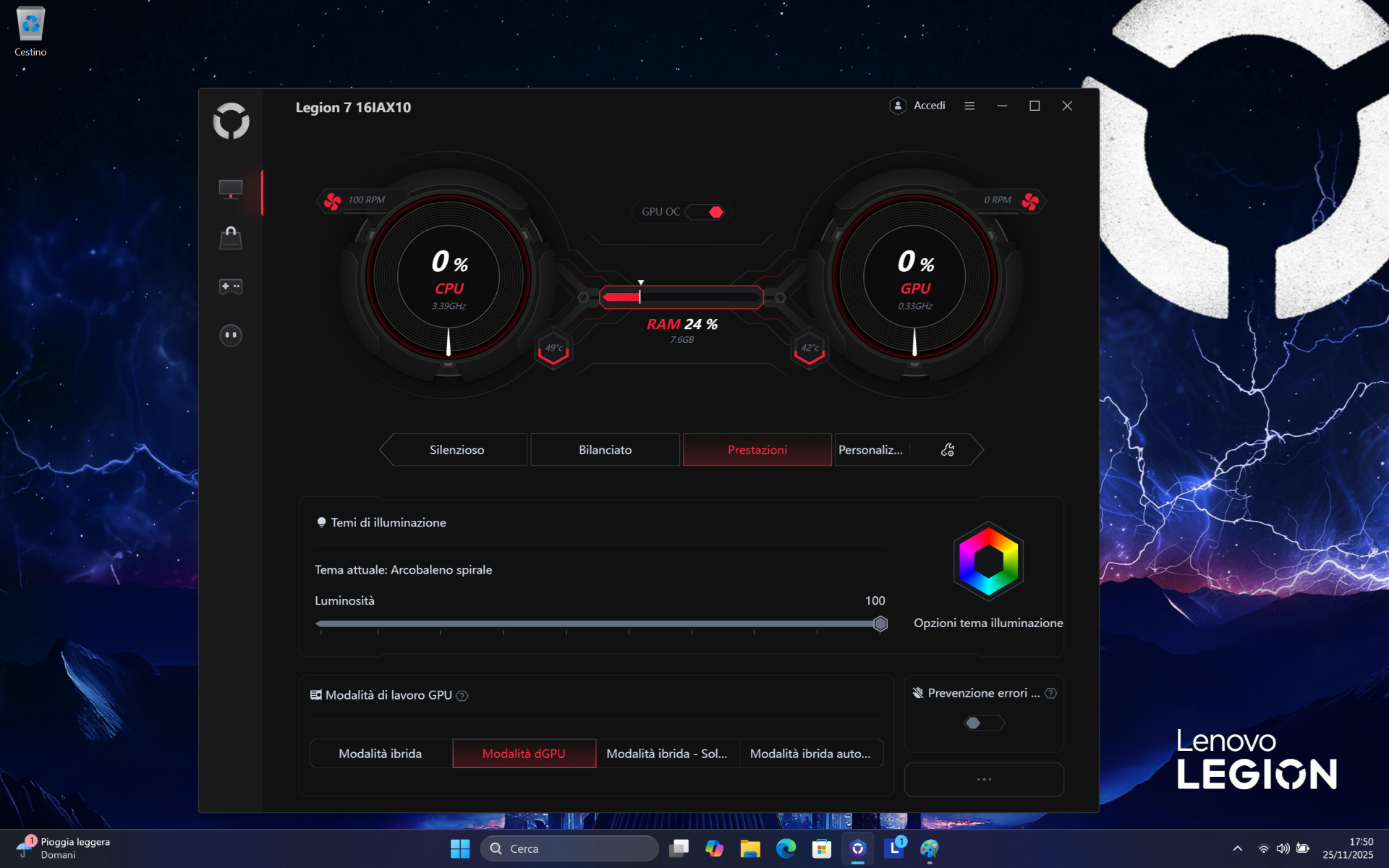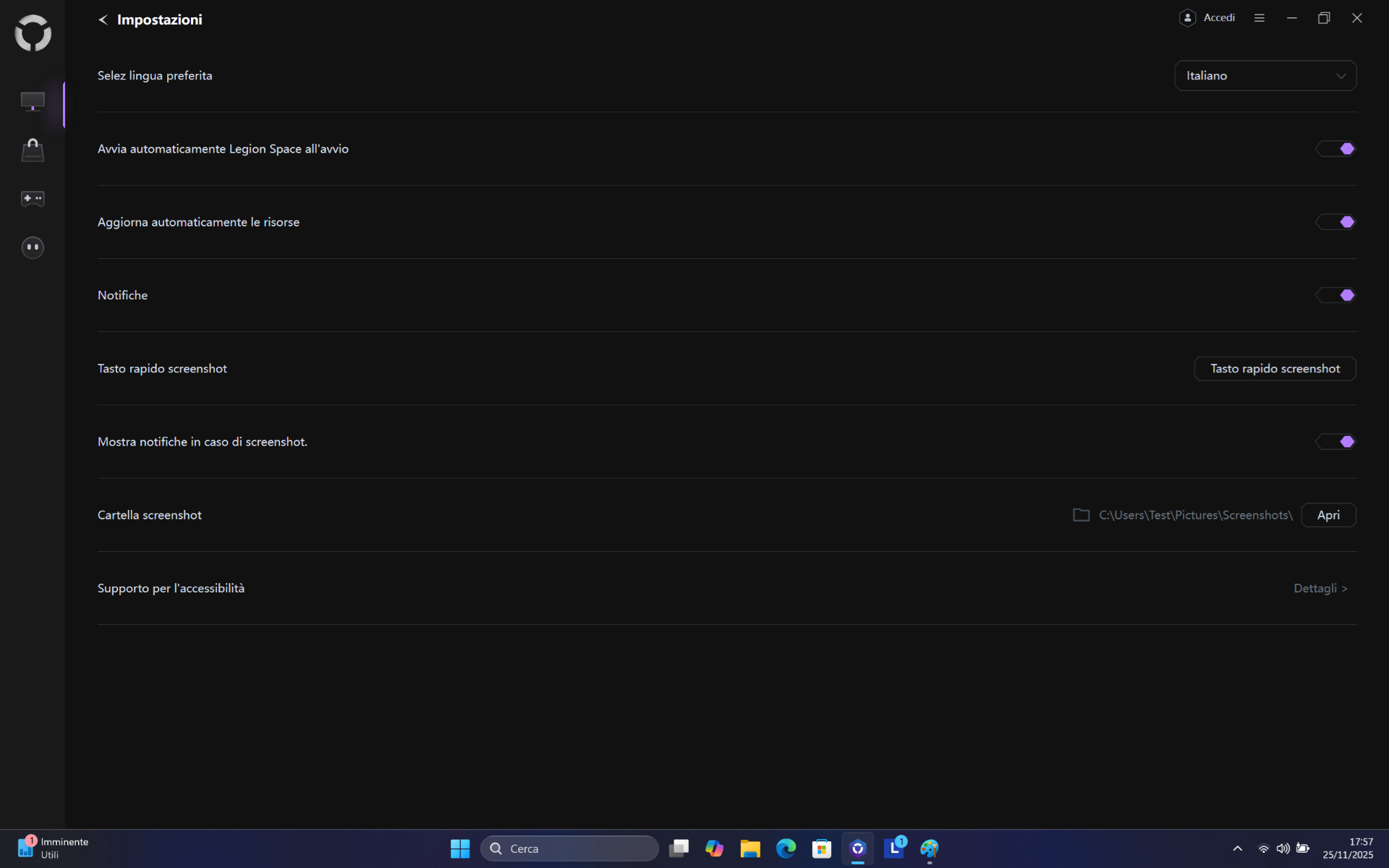 Con Legion Space si può anche personalizzare l’illuminazione della tastiera, gestire il nostro catalogo di giochi e molto altro ancora, tuttavia non mancano una serie di scorciatoie per cambiare al volo i profili energetici o modificare l’illuminazione RGB.
