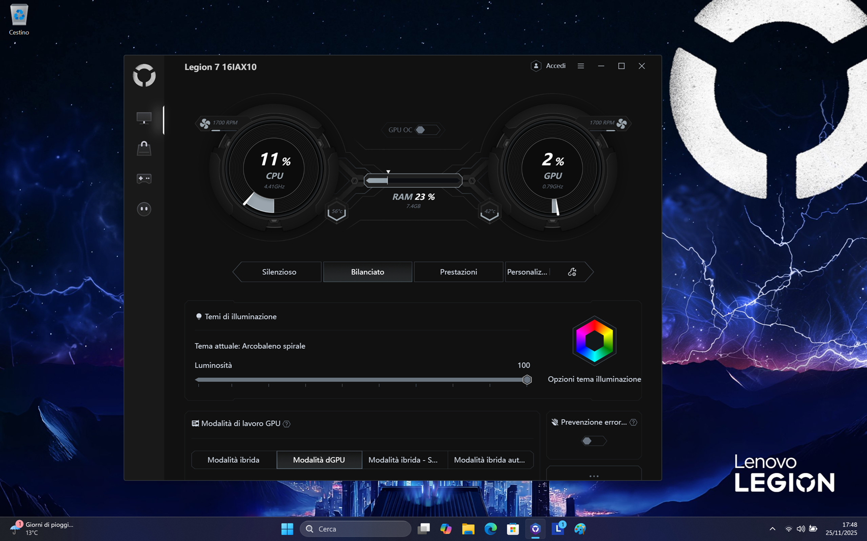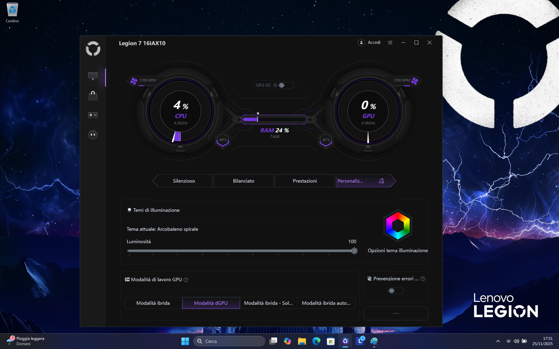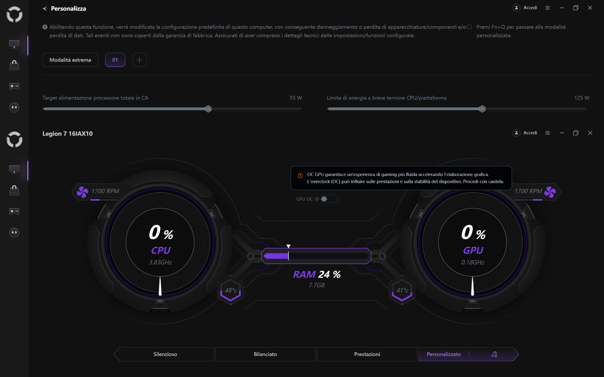 Prima di vedere come va nella pratica il Legion 7i 16 Gen 10 in ottica prestazioni, non possiamo omettere il software di gestione Lenovo Legion Space. L’utility proprietaria, migliorata e gestita anche dall’AI, permette di scegliere tra quattro profili energetico/prestazionali: Silenzioso, Bilanciato, Prestazioni e Personalizzato.