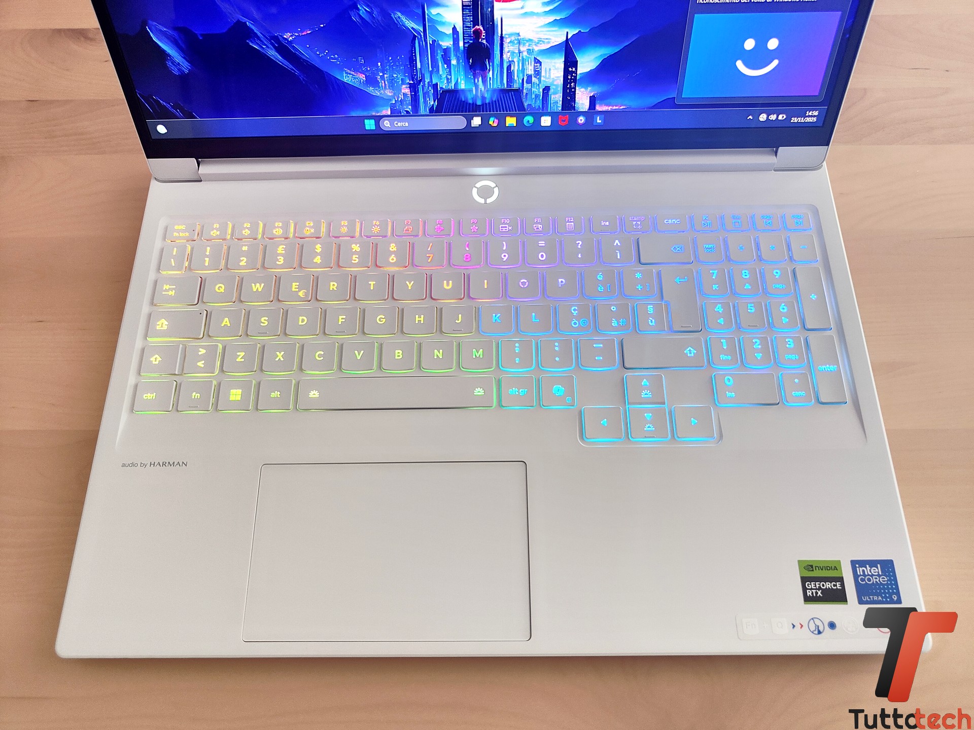 Molto comoda la tastiera RGB, generosi i tasti (più compatto il pad numerico) e abbastanza silenziosa, mentre per l’audio possiamo dire che siamo in linea con altri notebook che sposano il classico approccio 2x 2 watt, pur rilevando una qualità comunque buona e poco sopra la media.