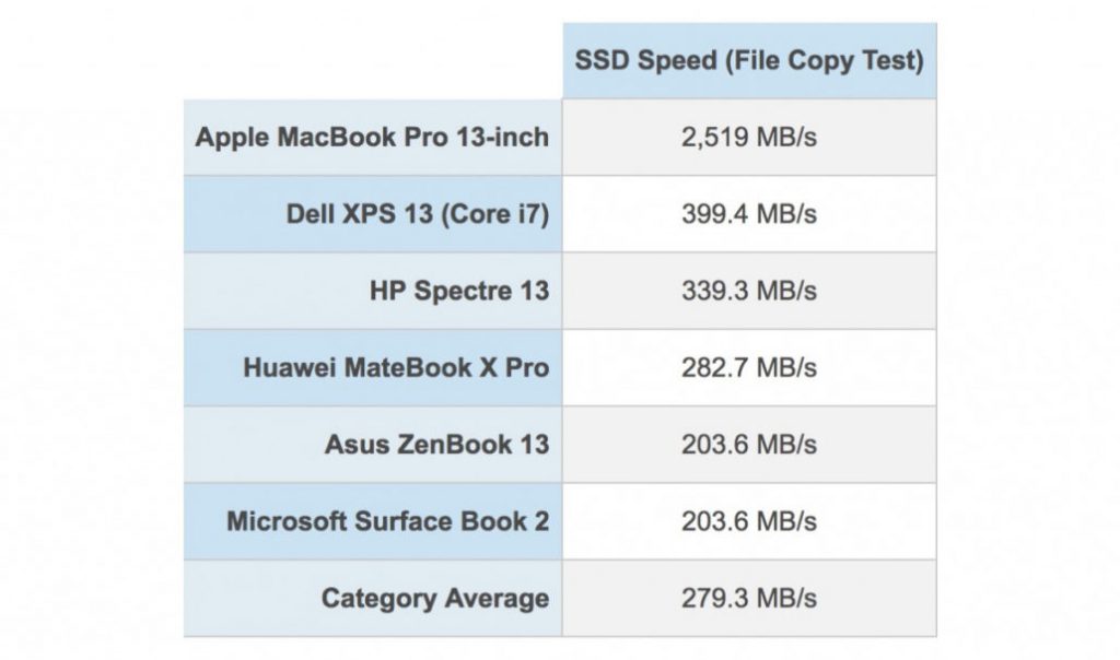 SSD di terze parti come i Samsung 970 EVO sono spesso installati in ultrabook che dispongono di uno slot SSD M.2 e che supportano lo standard NVMe per rendere il notebook più reattivo che mai. Tuttavia, non vi è alcun paragone con quelli equipaggiati da Apple.