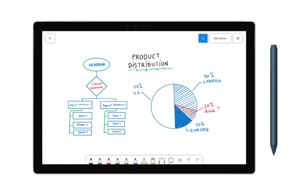 Per quanto riguarda l’app Whiteboard, permette agli utenti di collaborare su una lavagna intelligente attraverso i loro dispositivi Windows 10. Come in una lavagna fisica, l’app Whiteboard consente di disegnare, cancellare e allegare note adesive. Ma, a differenza di una lavagna tradizionale, puoi si può anche digitare del testo, aggiungere e manipolare le immagini e avere una quantità di spazio in continua espansione su cui lavorare. L’app Whiteboard è inoltre in grado di riconoscere e migliorare le forme, rendendo semplice la creazione di una tabella, ad esempio.