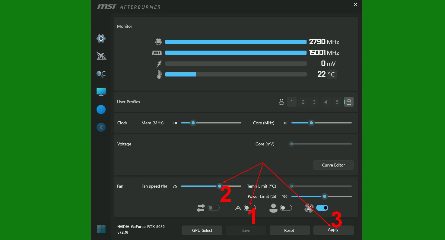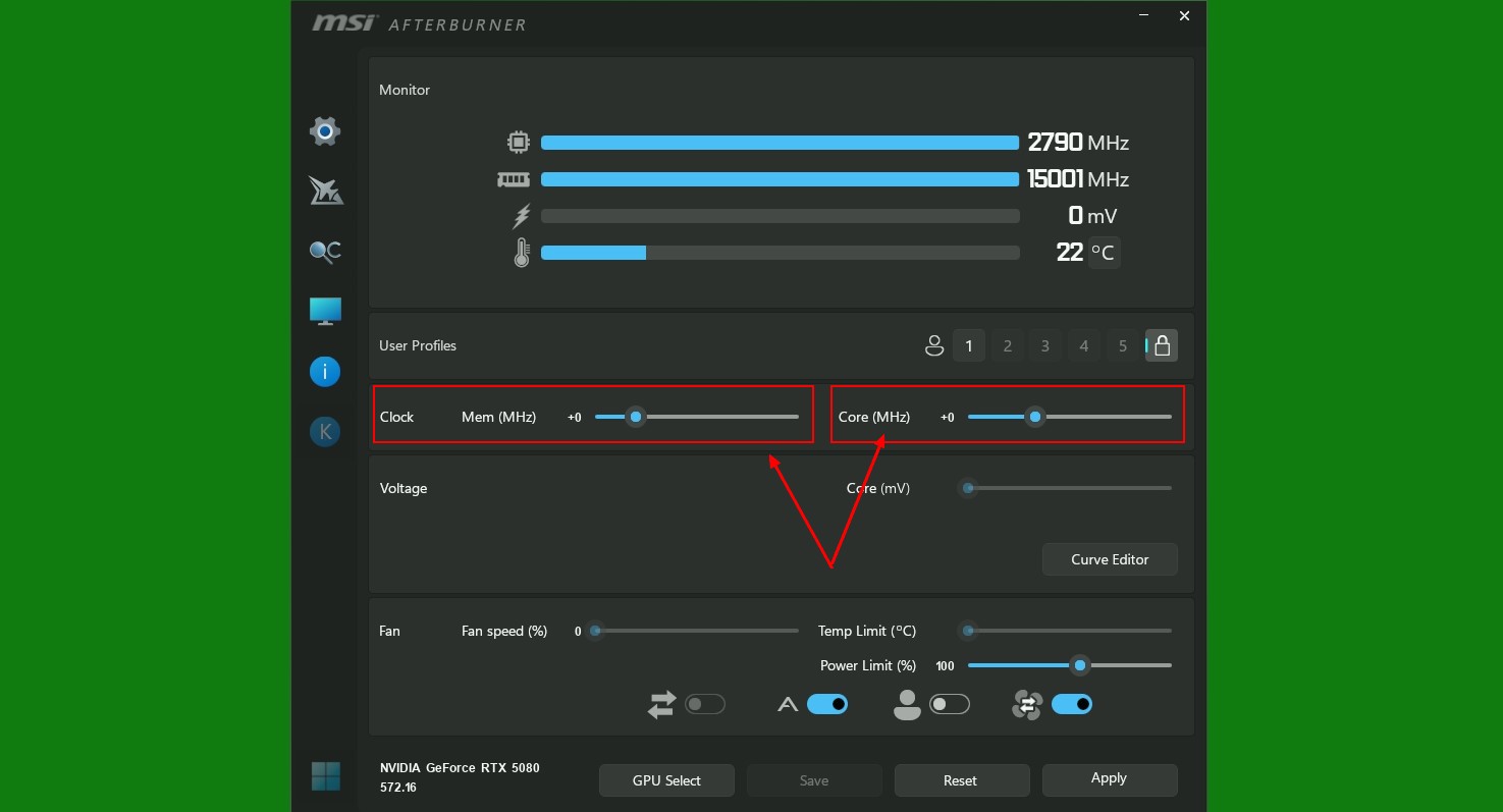 Installato il tutto, iniziamo con l’overclock vero e proprio. Per una questione di comodità la nostra scelta è ricaduta su Afterburner, in particolare perchè è stato aggiornato proprio in vista del lancio delle GeForce RTX 50. Apriamo quindi il software e, per chi non lo conosce, iniziamo a fare amicizia con l’interfaccia; non è molto complicata e ben in vista notiamo subito i cursori che permettono di incrementare la frequenza di GPU e memorie GDDR7.
