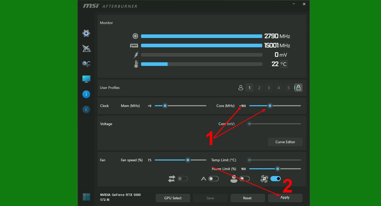 Non è una regola, ma solitamente le GPU NVIDIA hanno un buona propensione all’overclock, per questo il nostro secondo step potrebbe essere un ulteriore incremento del clock GPU di 50-75 MHz; ripetiamo la procedura sopra e in caso di stabilità continuiamo fino a quando la scheda risulta stabile e performante (tenendo sempre conto che non tutte le GPU hanno la stessa potenzialità).