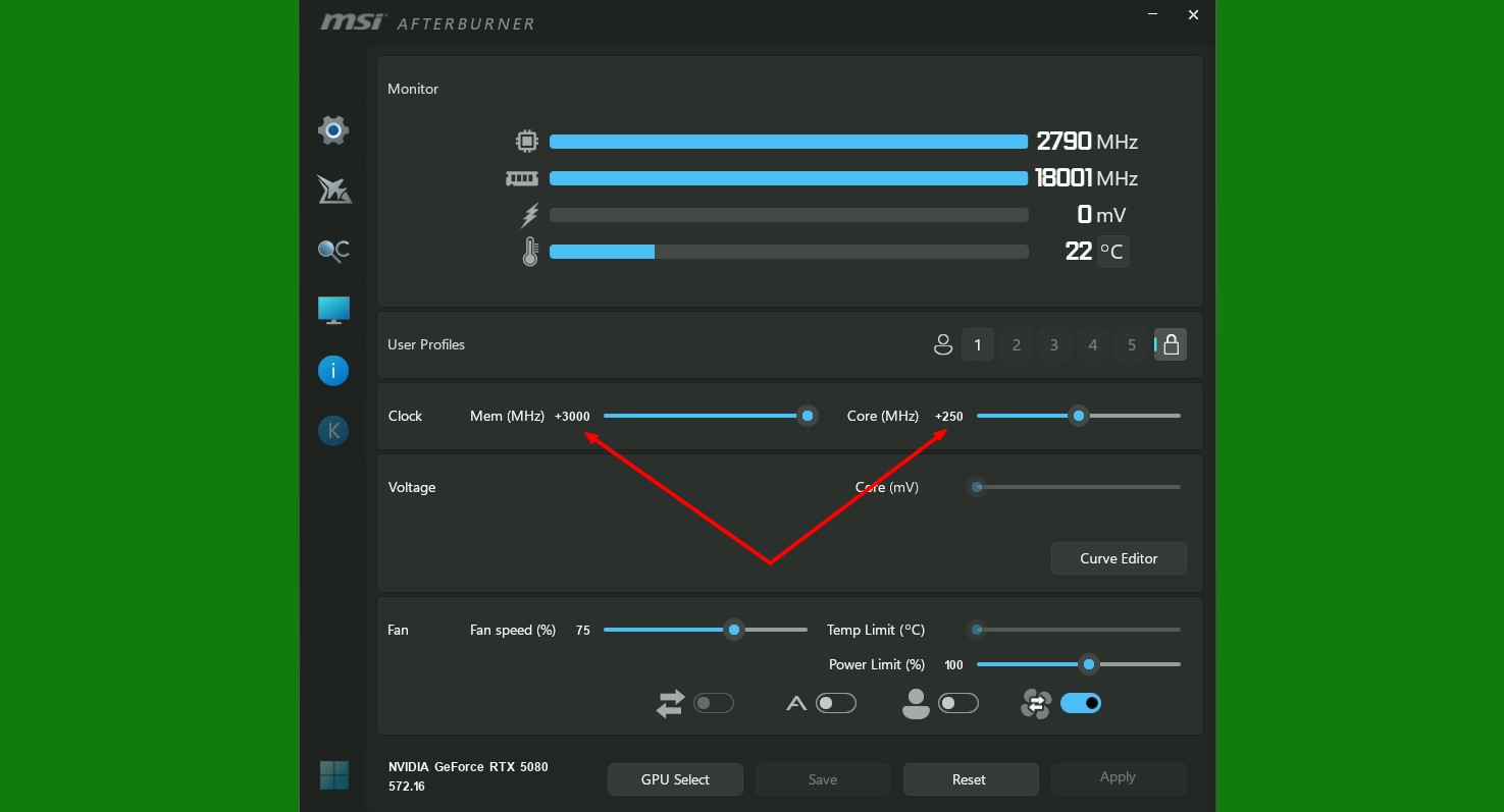 Qui consigliamo modifiche decrementali, solitamente partiamo con un primo step da +500 MHz, ricordando che la frequenza per la GDDR7 è da moltiplicare x2 (più o meno); in pratica, se sulla GeForce RTX 5080 aggiungete 500 MHz alla frequenza della VRAM vi ritroverete con una velocità GDDR7 pari a 31 Gbps (+ 1 Gbps). Gli step potrebbero essere anche inferiori, tuttavia il procedimento rimane identico e, almeno in questo caso, risulta semplice arrivare a fondo scala come abbiamo fatto noi.