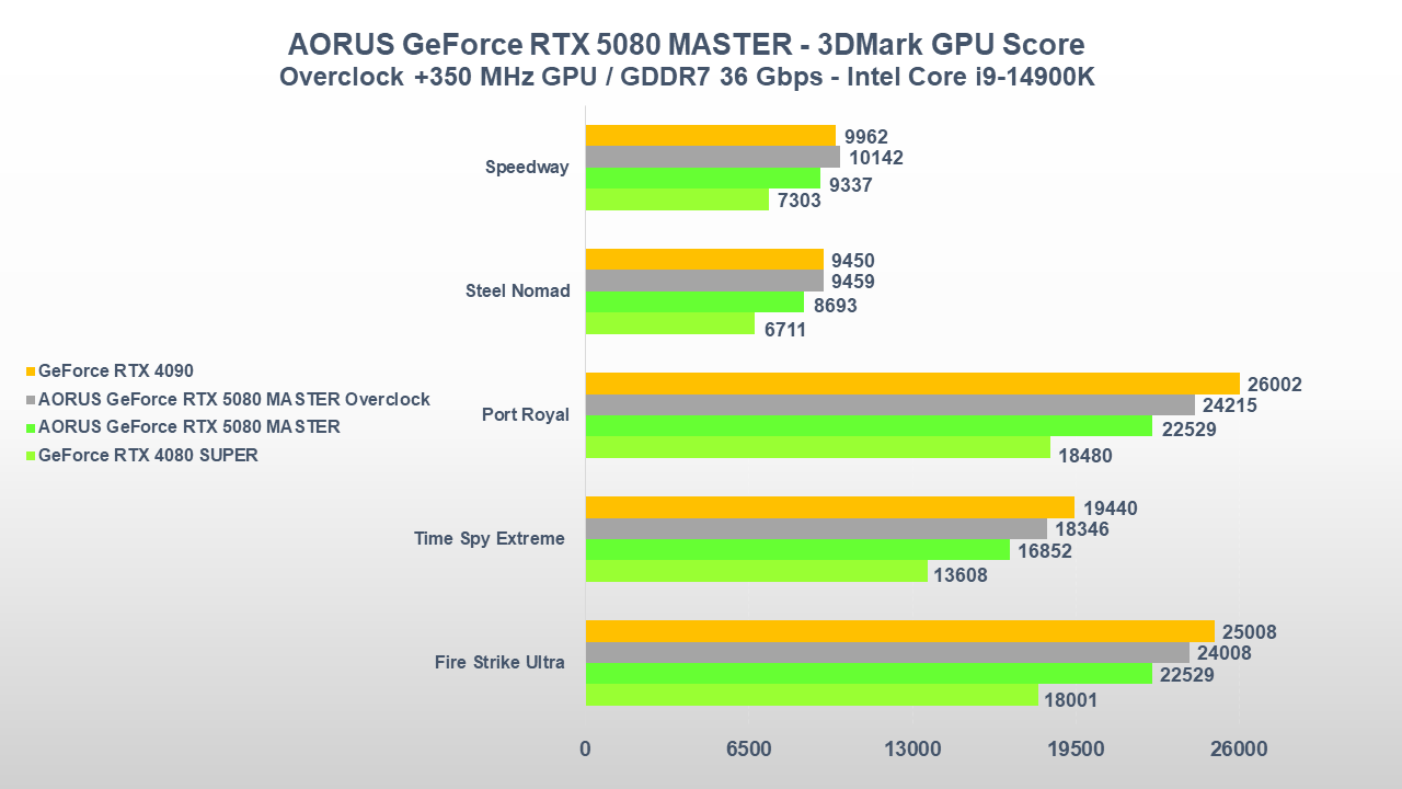Partiamo con i benchmark del 3DMark, ambito dove la AORUS GeForce RTX 5080 MASTER è (o meglio diventa) in media il 33,3% più veloce della GeForce RTX 4080 SUPER, avvicinandosi alla GeForce RTX 4090 e battendola nei test più recenti come 3DMark Steel Nomad (+40% su RTX 4080 SUPER) e Speedway.