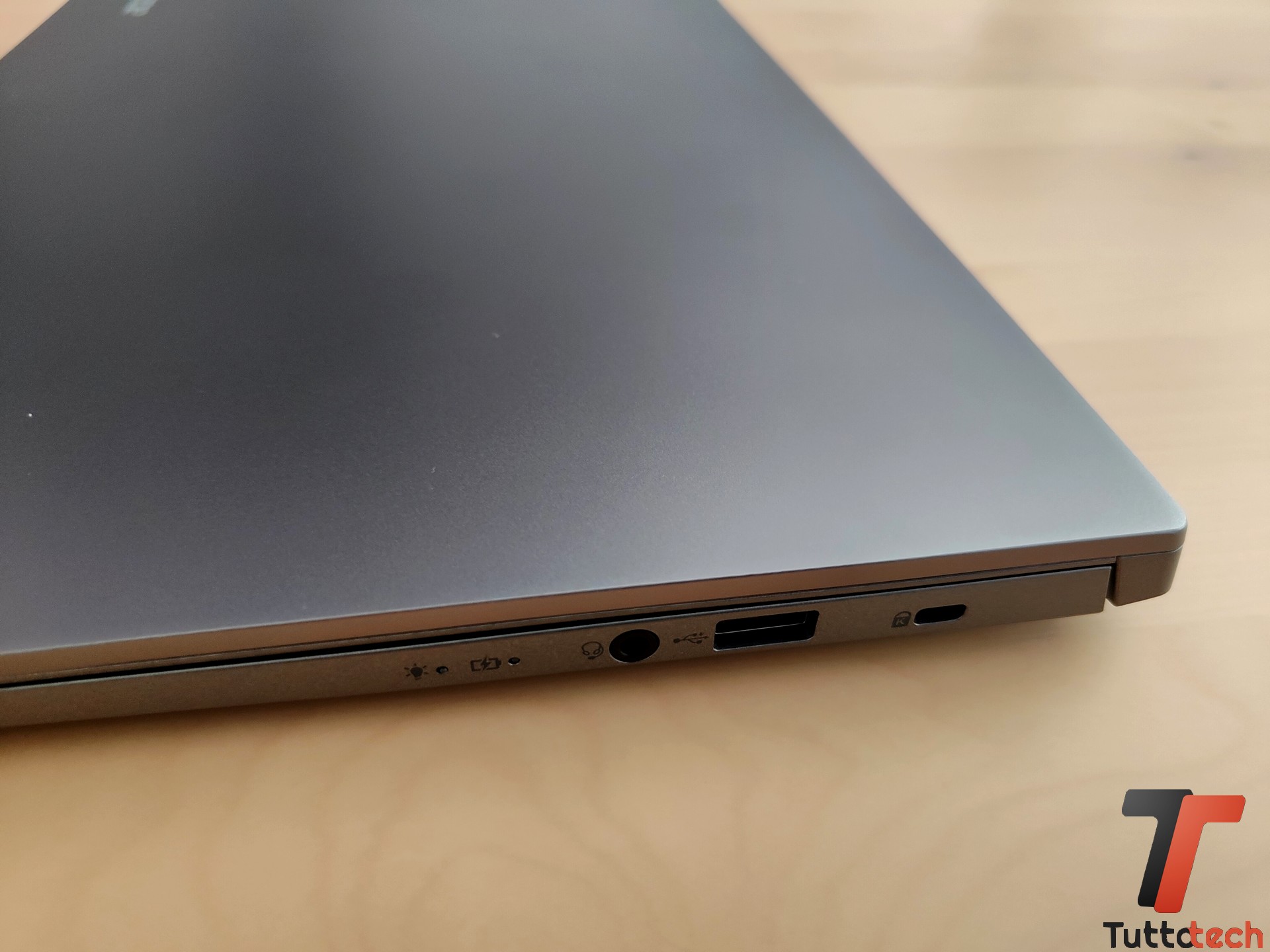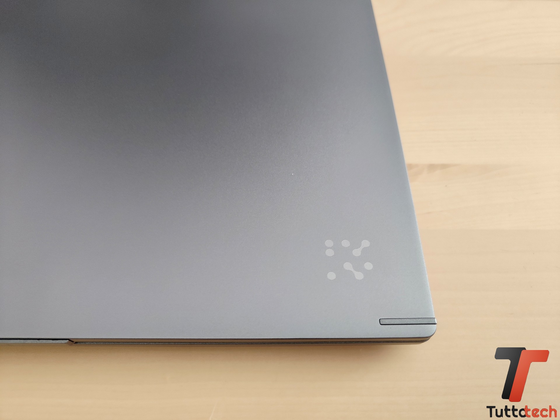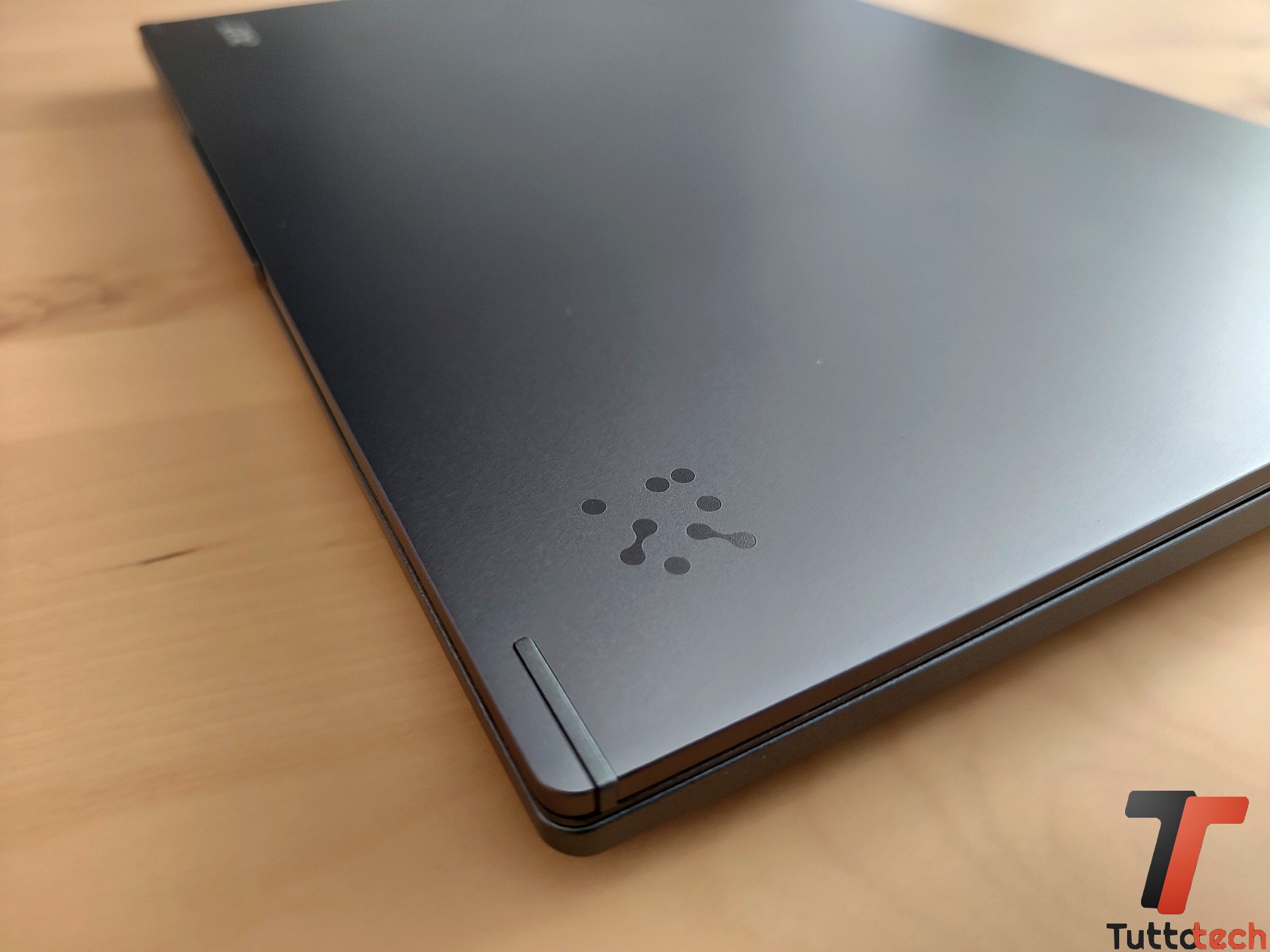 Il telaio, a parte le cornici del display piuttosto pronunciate, sembra comunque abbastanza curato; ci sono delle feritoie per lo smaltimento dell’aria posizionate sulla parte posteriore destra (cerniera) e sulla base, segno che le temperature non dovrebbero essere un problema con il chip Intel Core Ultra.