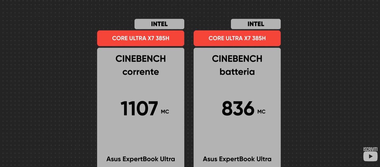 L’unico aspetto leggermente diverso rispetto a Lunar Lake riguarda la presenza di una piccola differenza di prestazioni tra modalità a batteria e alimentazione da rete. Va però contestualizzato: Panther Lake può spingersi senza limitazioni anche oltre 45 W, e quindi è normale che collegando il notebook alla corrente si ottenga un margine prestazionale leggermente superiore. Nelle modalità energetiche consigliate la differenza è praticamente impercettibile e diventa evidente solo utilizzando i profili più aggressivi, come quelli di tipo Turbo o Max Performance.