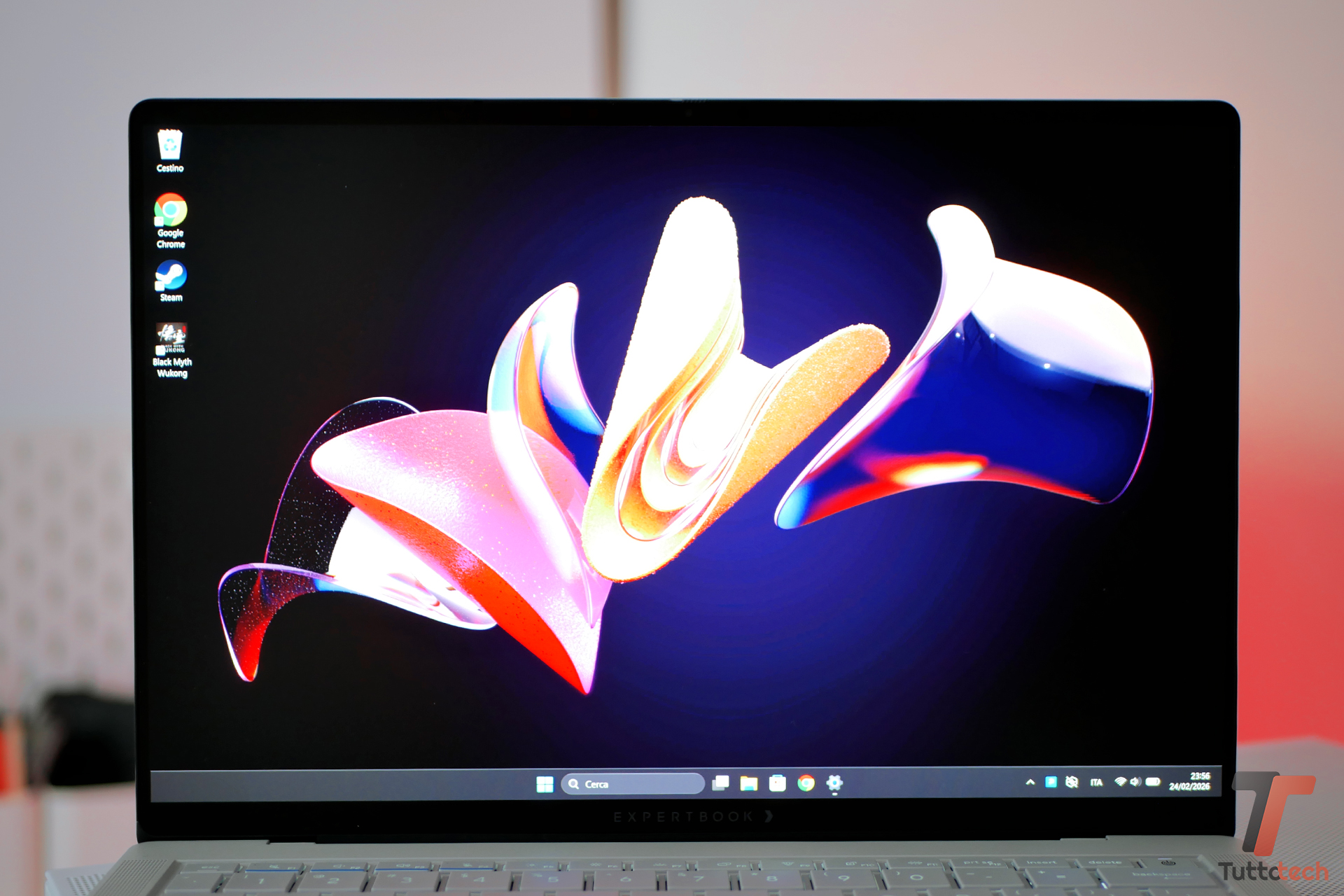 La sensazione al tatto è uno degli aspetti che colpiscono di più. Il palmrest ha una finitura quasi morbida e molto piacevole durante l’utilizzo prolungato, mentre la digitazione risulta solida e precisa. Anche i dettagli sono curati con attenzione: dai fori degli speaker, che offrono una qualità sonora sorprendentemente buona e paragonabile a quella dei MacBook, fino allo switch fisico per la privacy della webcam e alla cerniera estremamente fluida, che trasmette subito una sensazione di solidità.