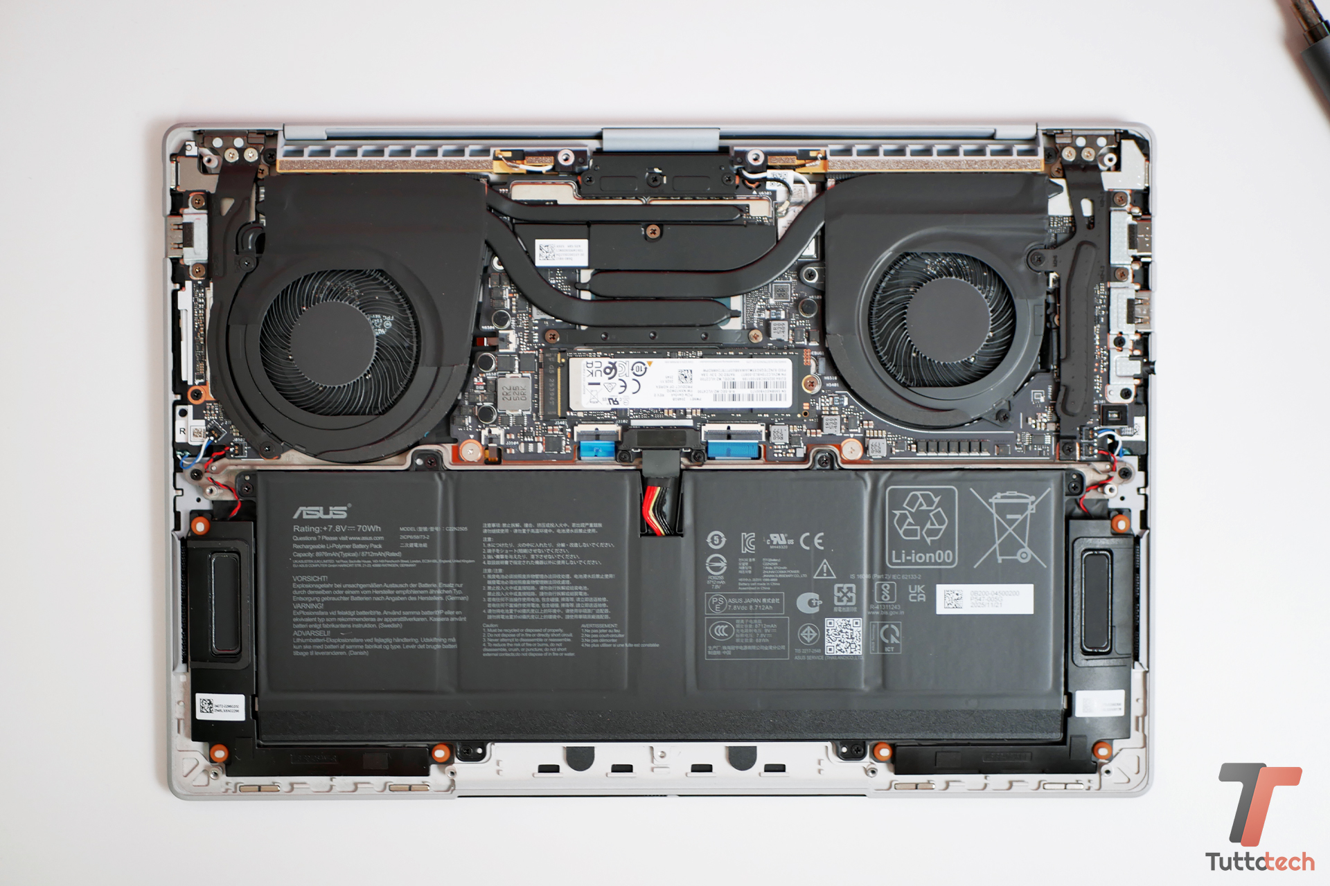 La struttura interna è stata progettata con grande attenzione, anche se le possibilità di aggiornamento sono limitate. L’unico componente realmente sostituibile è il modulo SSD, che nel nostro caso è un Samsung PCIe 5.0 estremamente veloce. Sotto di esso si trovano le memorie LPDDR5X da 32 GB, saldate sulla scheda madre, mentre anche il modulo WiFi 7 Intel è integrato direttamente sulla motherboard. In compenso ASUS ha lavorato molto sul sistema di antenne, progettato per migliorare stabilità e ricezione del segnale.