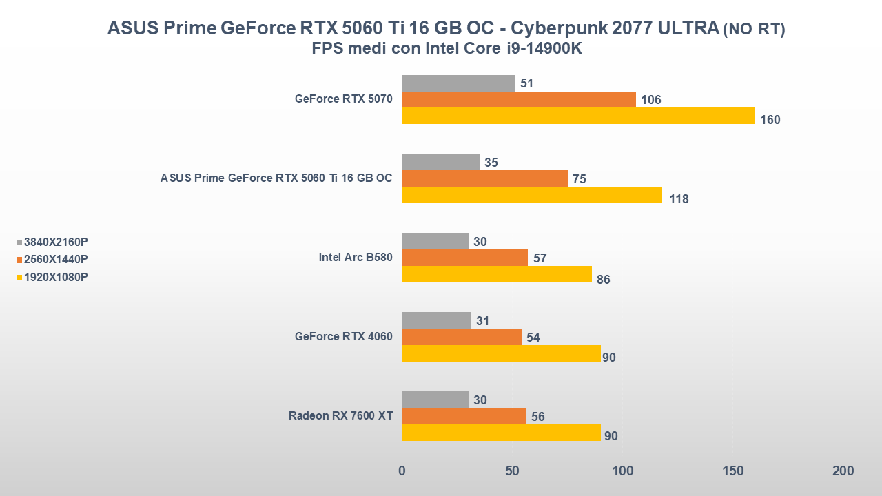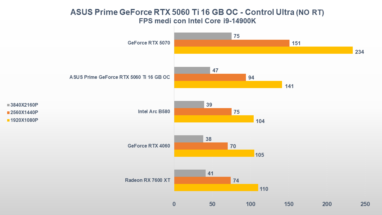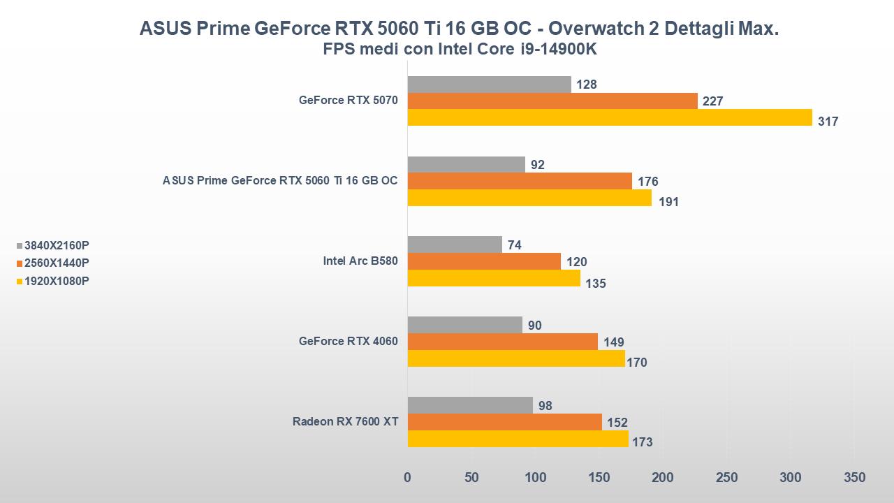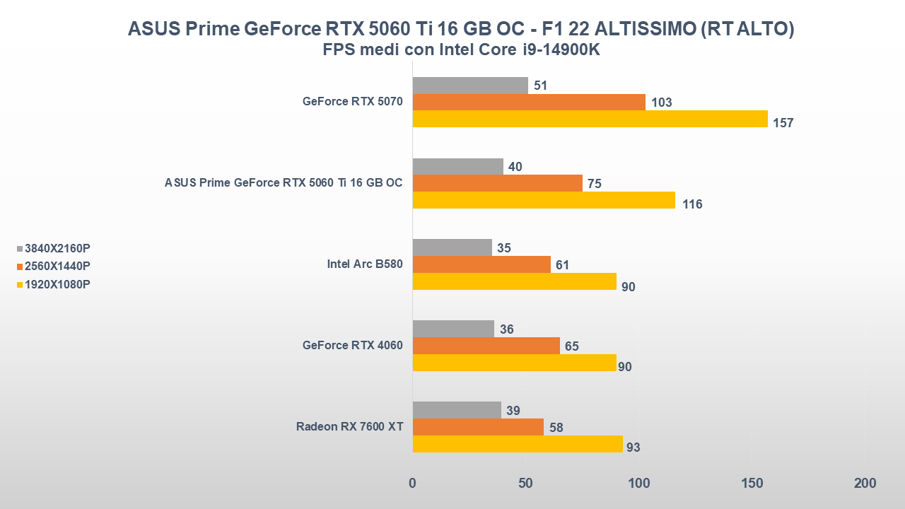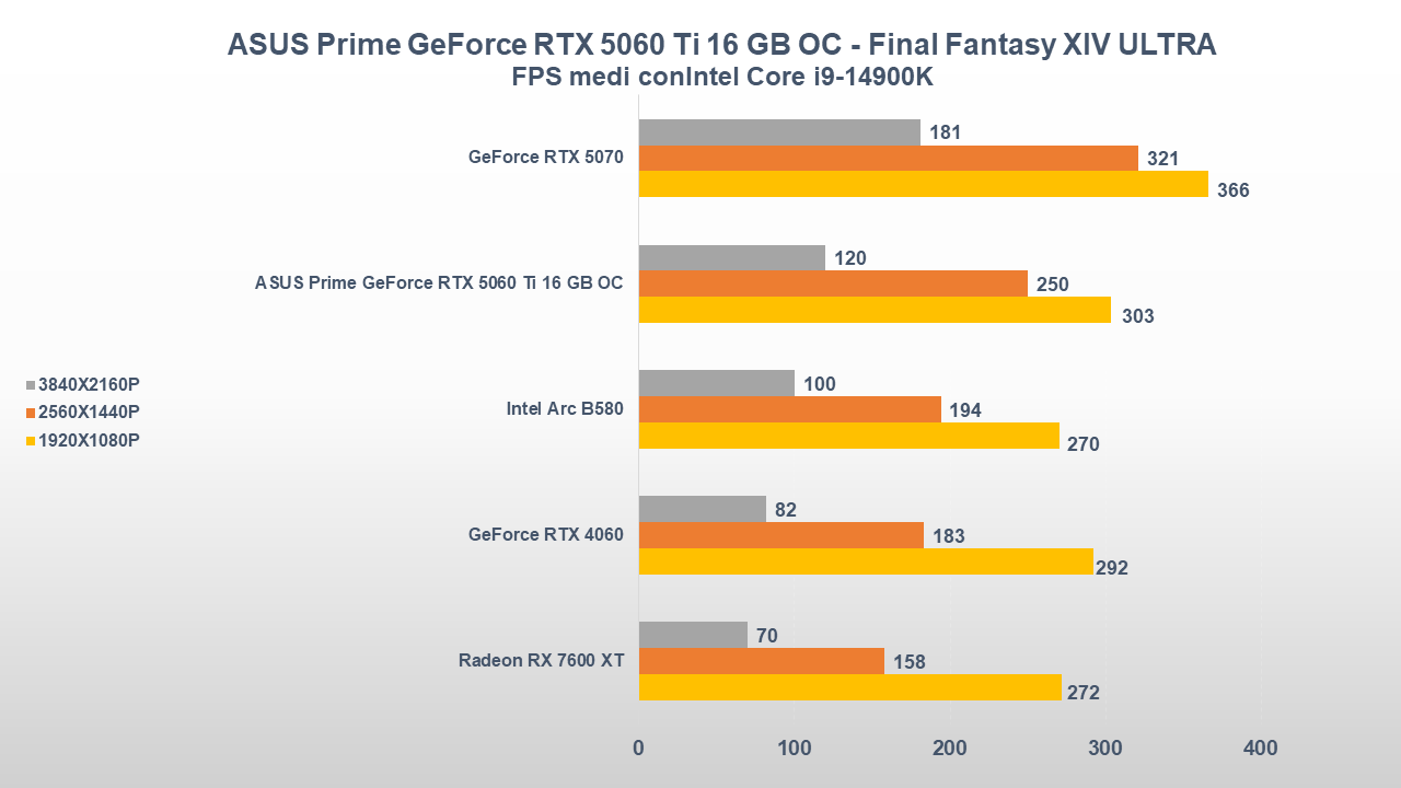 Come anticipato poco sopra, abbiamo già valutato le potenzialità della GeForce RTX 5060 Ti 16 GB rispetto ai vari modelli di GPU presenti nel nostro database; per l’occasione invece, abbiamo pensato a un confronto più ristretto tra la nuova ASUS Prime GeForce RTX 5060 Ti 16 GB OC e altri quattro modelli che attualmente si collocano in una fascia vicina o inferiore all’ultima proposta NVIDIA (inclusa la GeForce RTX 5070).