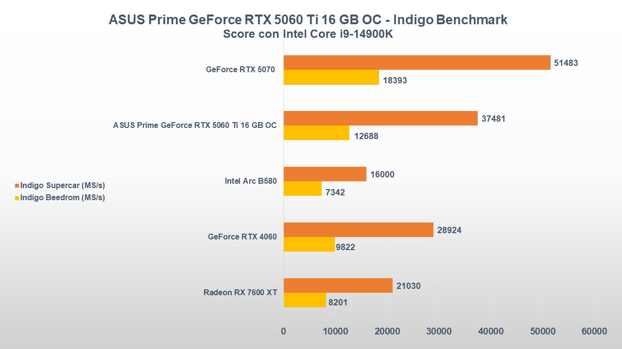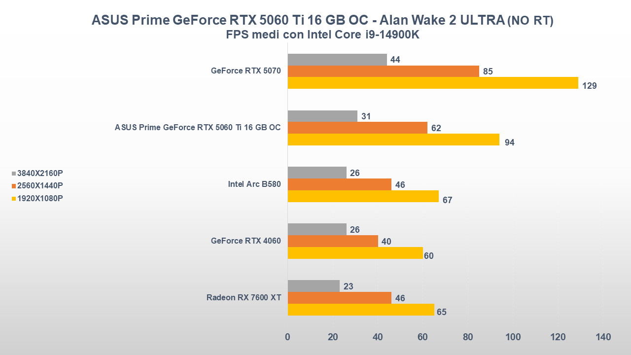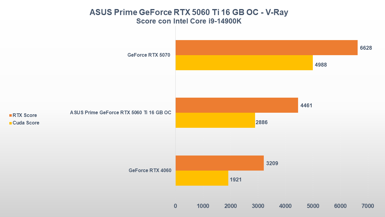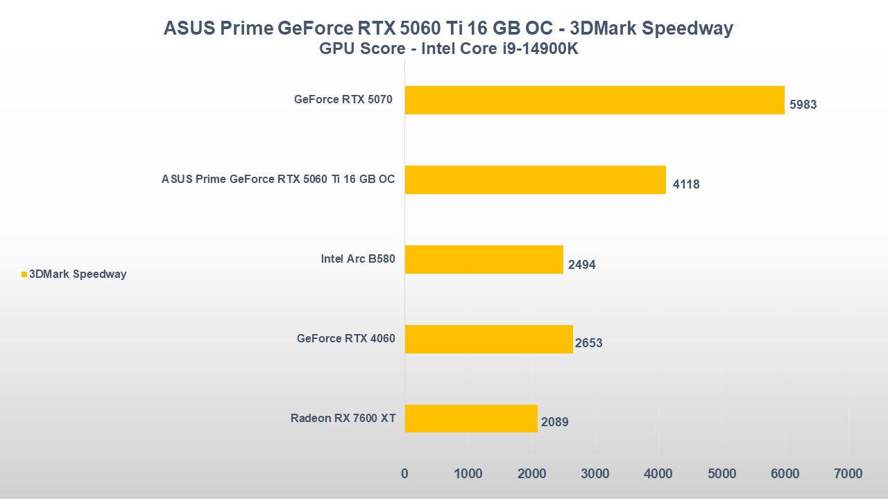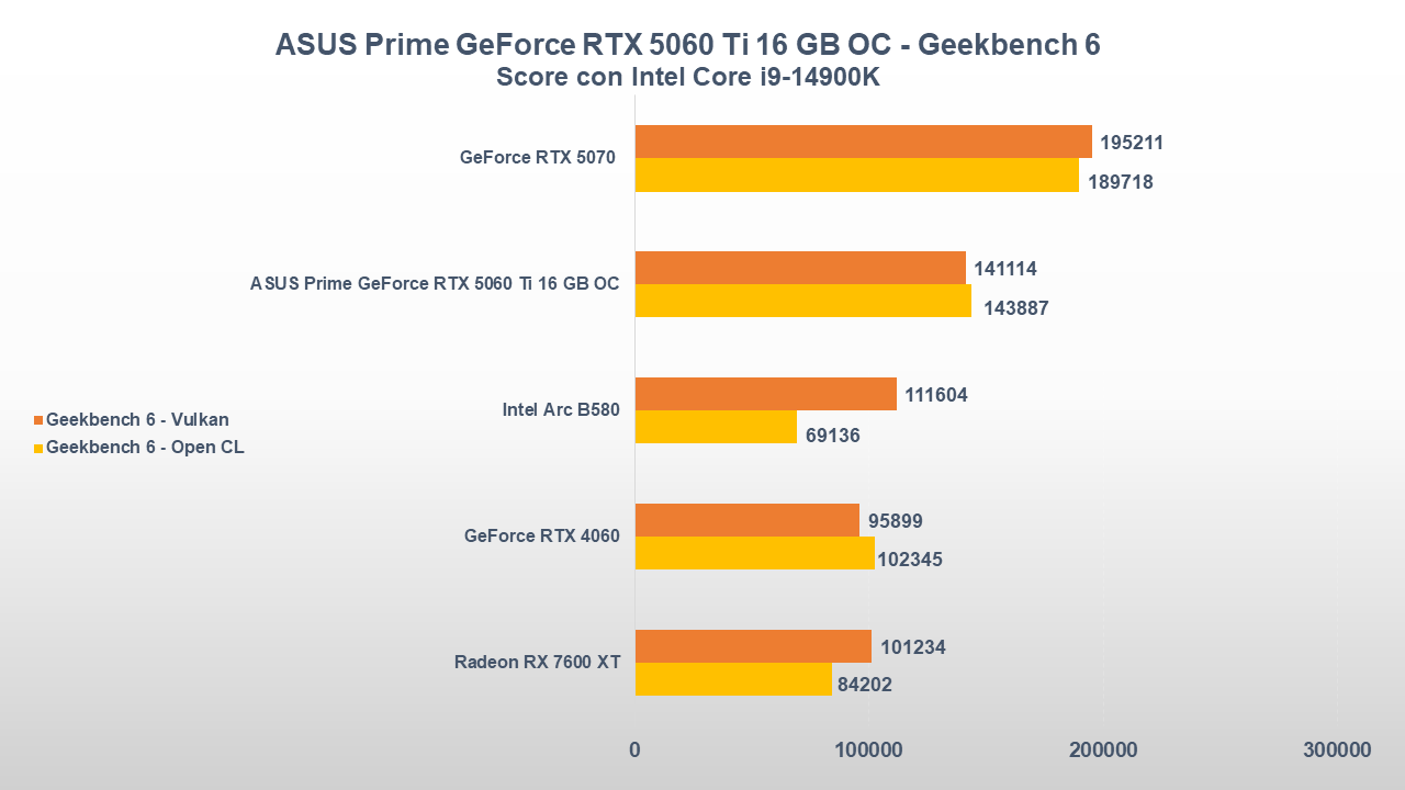 Come anticipato poco sopra, abbiamo già valutato le potenzialità della GeForce RTX 5060 Ti 16 GB rispetto ai vari modelli di GPU presenti nel nostro database; per l’occasione invece, abbiamo pensato a un confronto più ristretto tra la nuova ASUS Prime GeForce RTX 5060 Ti 16 GB OC e altri quattro modelli che attualmente si collocano in una fascia vicina o inferiore all’ultima proposta NVIDIA (inclusa la GeForce RTX 5070).