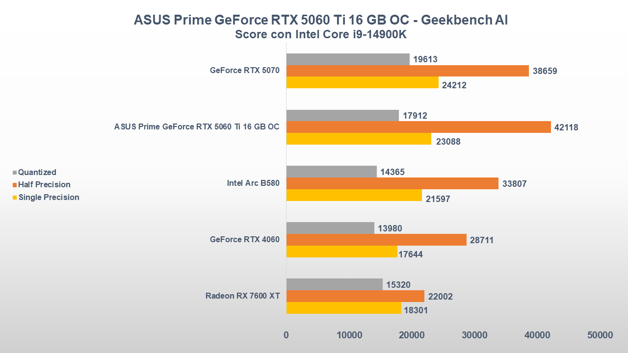 I risultati sono abbastanza semplici da interpretare e ci dicono che il divario con modelli come GeForce RTX 4060, Radeon RX 7600 XT e Intel Arc B580 è piuttosto marcato, potremmo dire in linea con lo “stacco” che ritroviamo tra questa nuova GeForce RTX 5060 Ti e la più potente GeForce RTX 5070.