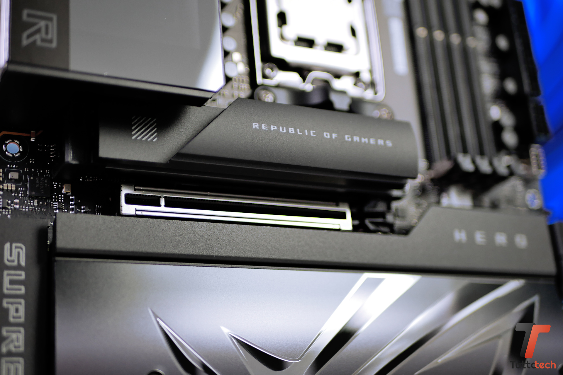 ASUS ha sempre prestato grande attenzione anche alla facilità di montaggio delle sue schede madri, e la Crosshair X870E Hero non fa eccezione, fa il next step. Tra le novità più apprezzabili troviamo il nuovo PCIe Q-Release Slim, una versione aggiornata della funzione di rilascio rapido della GPU che permette di rimuovere facilmente le schede grafiche di grandi dimensioni semplicemente facendole scorrere senza dover esercitare pressioni eccessive o temere di danneggiare la scheda madre. Questa funzione è particolarmente utile per chi aggiorna frequentemente il proprio sistema o per chi effettua manutenzione regolare, offrendo un’accessibilità senza pari.