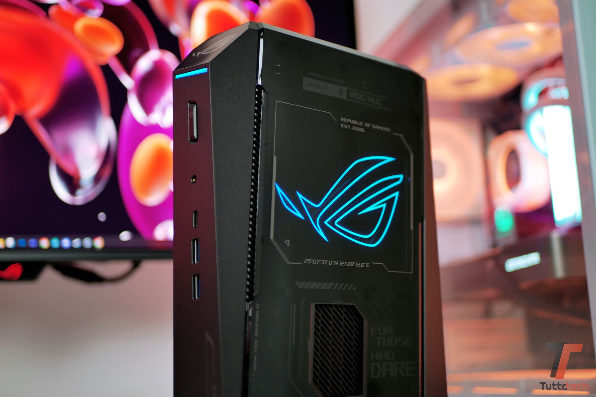 Il vero punto di forza però è ciò che questo chassis riesce a contenere. Inserire Core Ultra 9 e GeForce RTX 5080 in un volume così ridotto non è banale, ed è qui che ASUS mostra tutta la sua esperienza. La compattezza lo rende facile da posizionare ovunque e anche trasportabile senza troppi compromessi, una caratteristica che cambia completamente il modo di pensare una postazione gaming o una workstation da salotto.