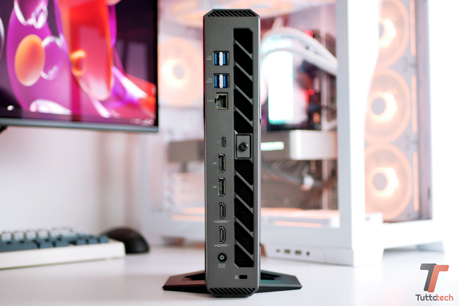 Sul fronte connettività non manca nulla. Davanti troviamo jack audio, USB-C 3.2 e USB-A, mentre sul retro c’è un assortimento completo con Ethernet 2.5G, altre USB-C e USB-A, due DisplayPort, due HDMI, ingresso di alimentazione e Kensington Lock. Una dotazione da vero desktop, concentrata in pochissimo spazio.