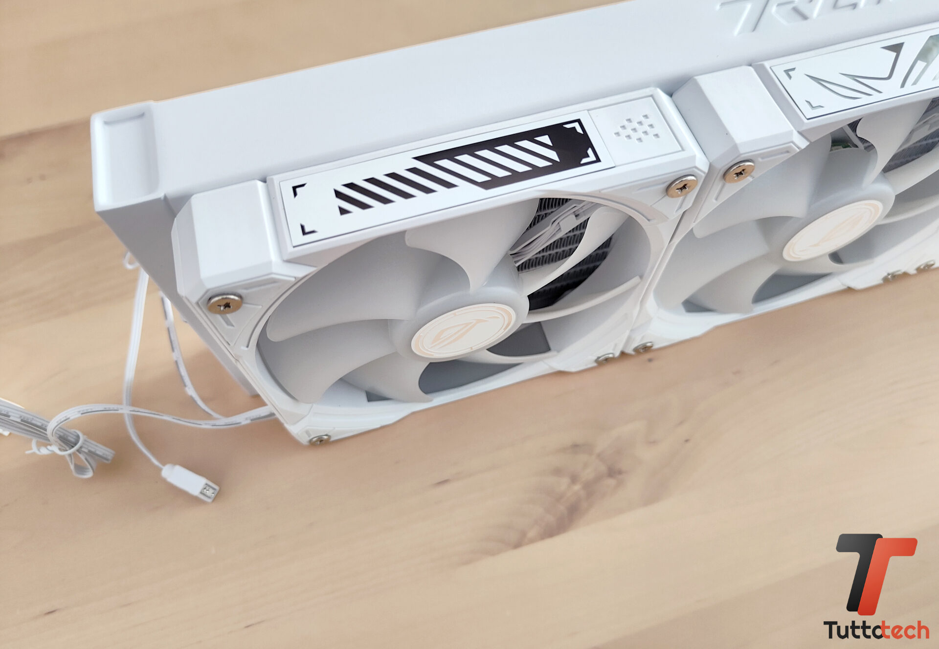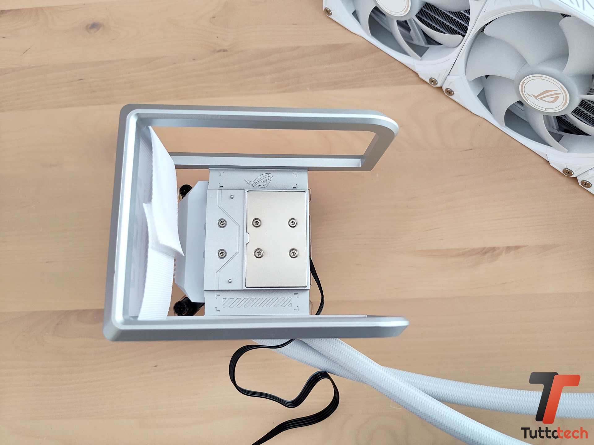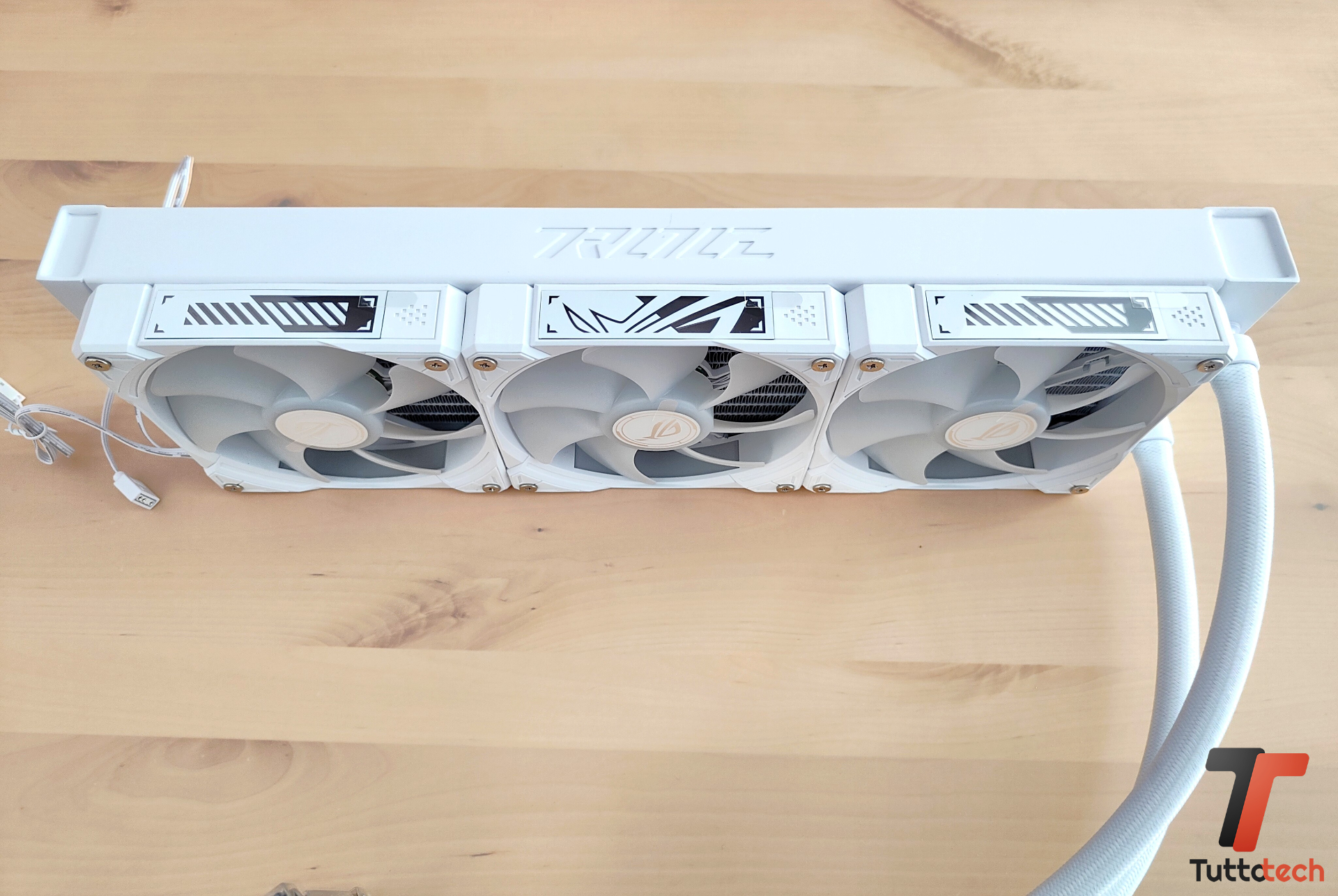 Dal radiatore escono i due tubi che portano il liquido refrigerante, realizzati in gomma e ricoperti in nylon, con una lunghezza di 40 centimetri e una buona flessibilità. Rimanendo nella zona radiatore, in dotazione troviamo preinstallate tre ventole da 120 mm ad alte prestazioni ROG RYUO IV MF-12C ARGB, capaci di spingersi a 2.000 RPM con una rumorosità dichiarata di 30,7 dBA.