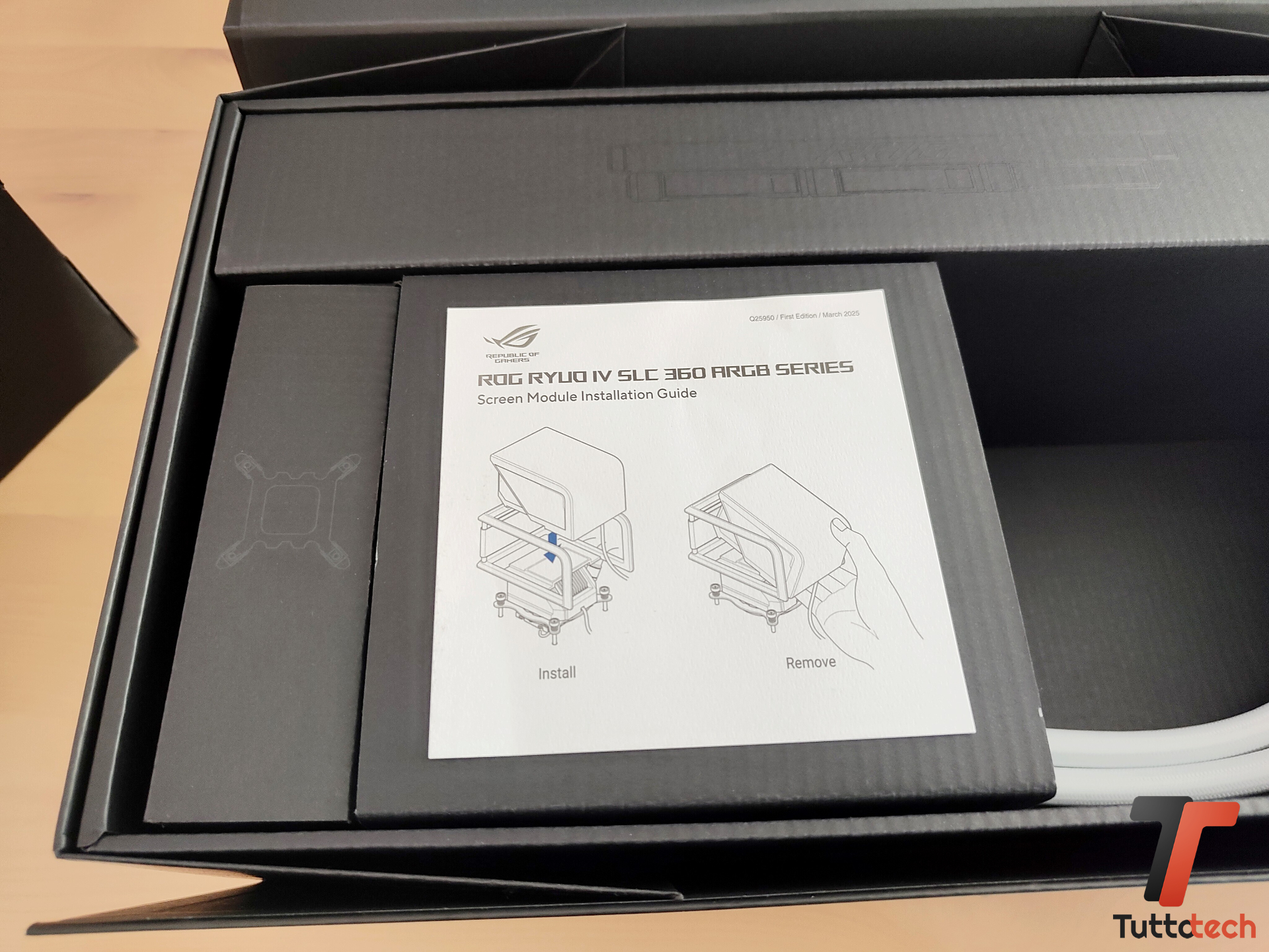 Nonostante la mole del waterblock con il display AMOLED da 6,67″, l’installazione del dissipatore ASUS non risulta particolarmente impegnativa. Il display arriva separato dal waterblock e serve solo inserirlo nell’apposita guida, questo ovviamente dopo aver installato il waterblock con il kit di ritenzione AM5 fornito in bundle sulla scheda madre