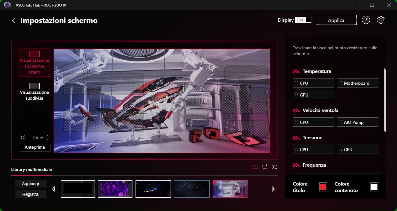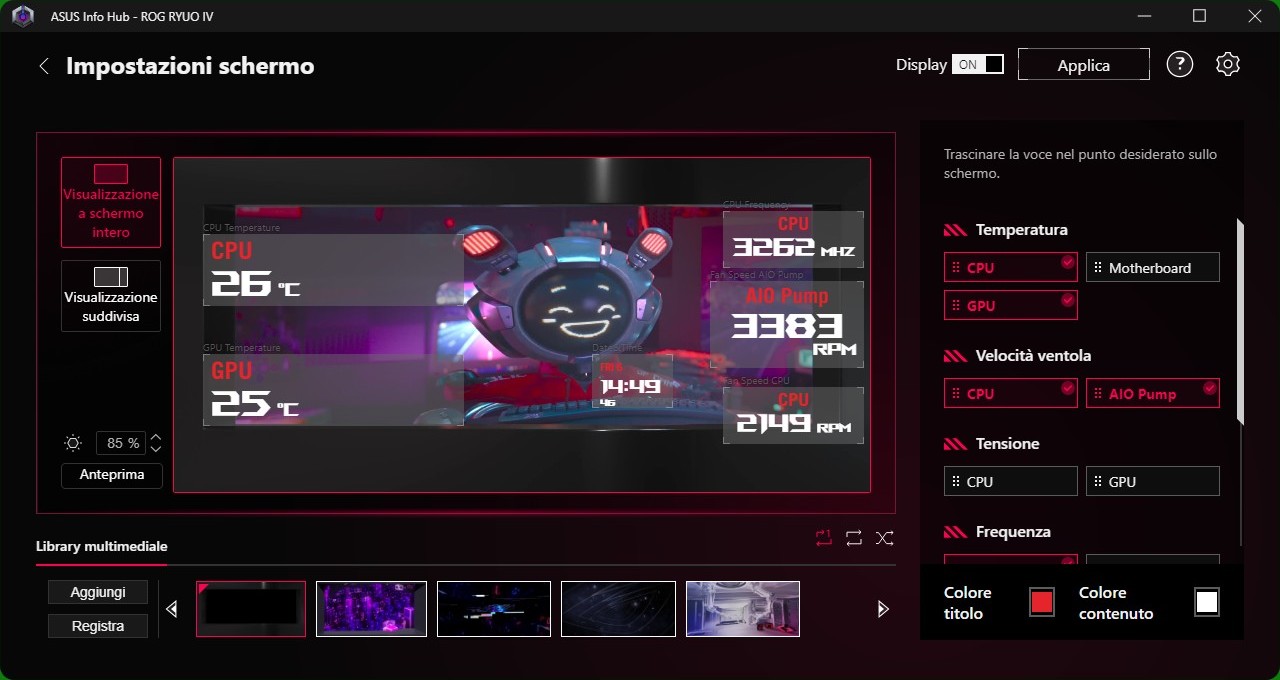 Il software ASUS InfoHub è risultato abbastanza fluido; presenta già dei contenuti precaricati di default, come detto personalizzabili, senza dimenticare che possiamo anche scegliere la posizione dove collocare le metriche di sistema o l’ora.