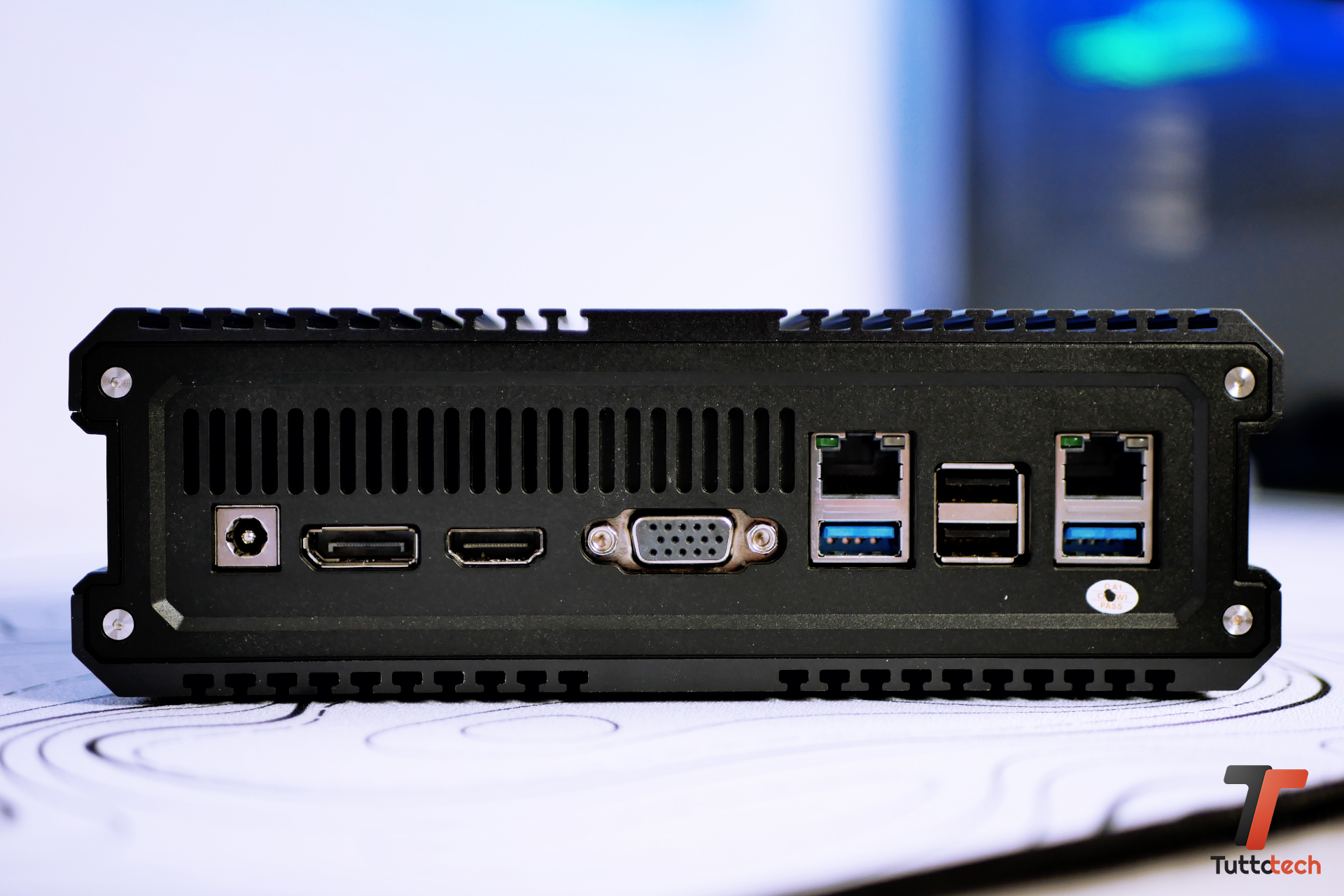 Si tratta di un box in alluminio super massiccio, una vero e proprio mattone in alluminio con delle linee estetiche che piacciono. Può essere posto in orizzontale e verticale senza problemi, resta sempre molto bello da vedere e funzionale perché le poche ma buone prese d’aria che ci sono non vengono mai ostacolate. Le porte a disposizione sono un bel po’: 2 USB 3.0, 2 USB 2.0, 1 HDMI, 1 DisplayPort, 1 VGA, 2 RJ45, Audio combo ed infine una porta USB-C.
