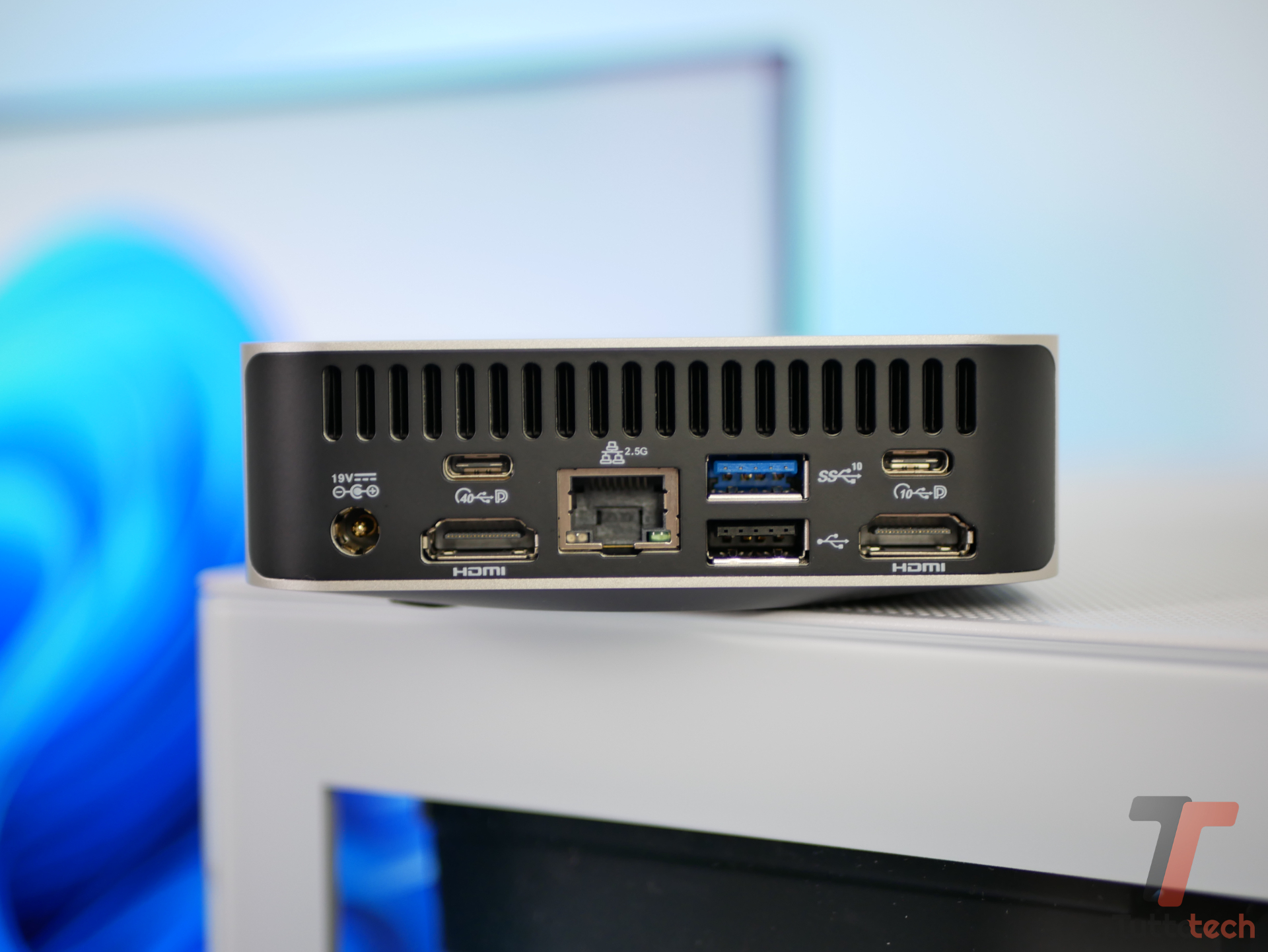 Sul frontale trovano posto due porte USB-A 3.2 Gen 2, una delle quali compatibile con Power Delivery, affiancate da un jack audio da 3,5 mm. Manca una porta USB-C anteriore, una scelta che può far storcere il naso a chi punta su un accesso rapido a questo standard. Più generosa la dotazione posteriore, dove sono presenti una USB-C 4 Gen 3, una USB-C 3.2 Gen 2, due porte HDMI, due USB-A (una 3.2, l’altra 2.0), una porta Ethernet da 2.5 Gbps, uno slot per schede SD full-size e l’attacco VESA. Il form factor ridotto è reso possibile anche dalla scelta di un’alimentazione esterna: un alimentatore da 120 W compatto e relativamente discreto, che consente di liberare spazio interno per una migliore organizzazione delle componenti.