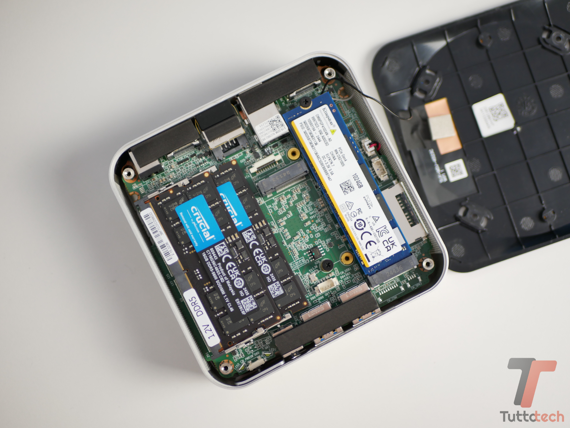 Lo chassis può essere aperto con facilità: bastano quattro viti nascoste sotto i piedini in gomma. L’unico elemento a cui prestare attenzione durante lo smontaggio è l’antenna del modulo Wi-Fi 6E, ma si tratta di una precauzione comune. Una volta all’interno, si apprezza la presenza di due slot per RAM DDR5 a 4800 MHz (entrambi sostituibili) e di due slot M.2, uno dei quali già occupato da un SSD PCIe 4.0 da 1 TB. Il secondo slot, va precisato, è compatibile unicamente con moduli in formato 2242.