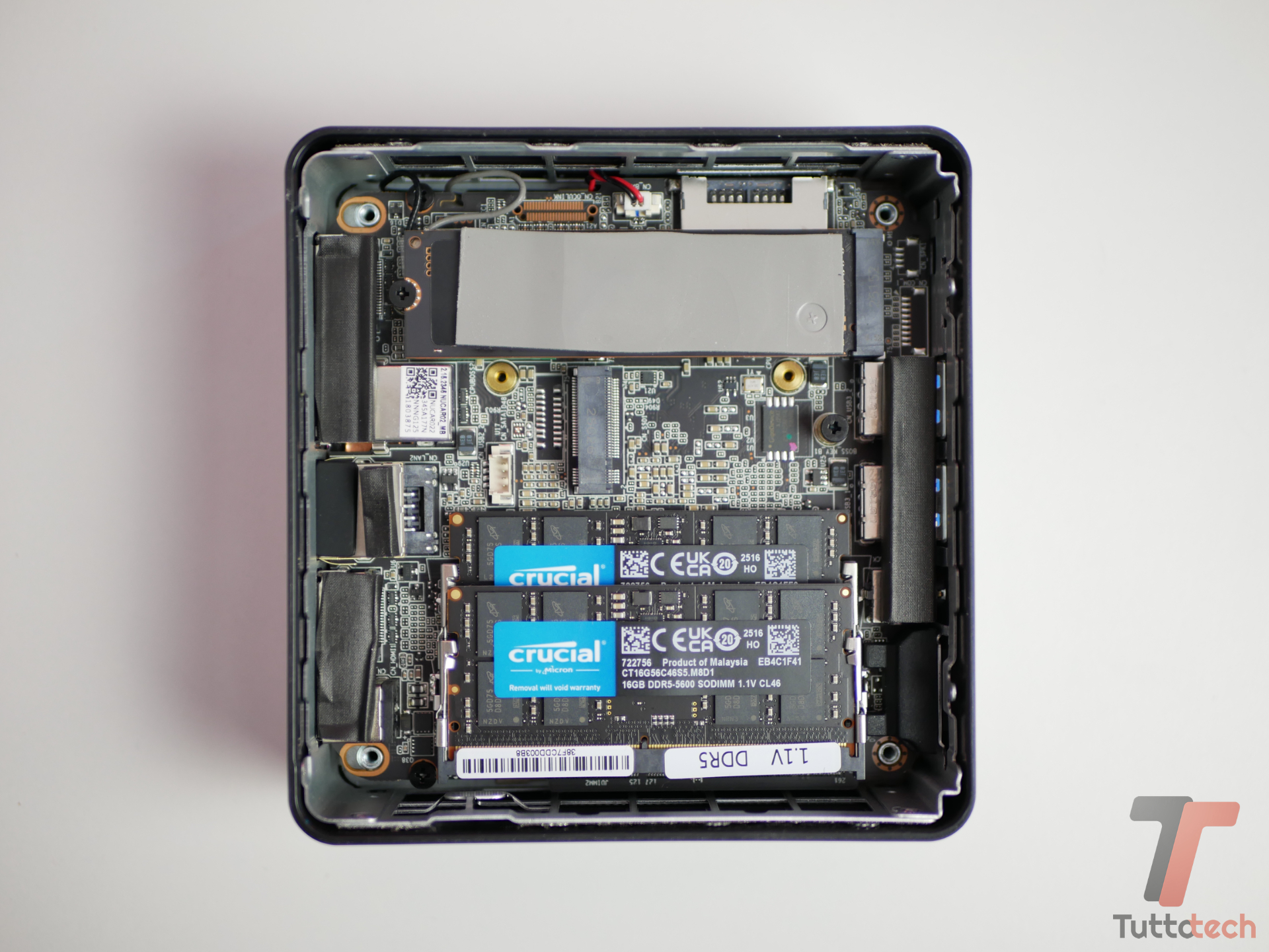 Ottima invece la manutenibilità. Come ormai consuetudine per Geekom, lo smontaggio è immediato: basta svitare le quattro viti nascoste sotto i piedini per accedere rapidamente all’interno. All’interno troviamo due slot DDR5 a 5600 MHz firmati Crucial, uno slot M.2 PCIe 4.0 già occupato da un SSD da 2TB, un modulo Wi-Fi 7 sostituibile e un secondo slot M.2 nel formato più compatto.