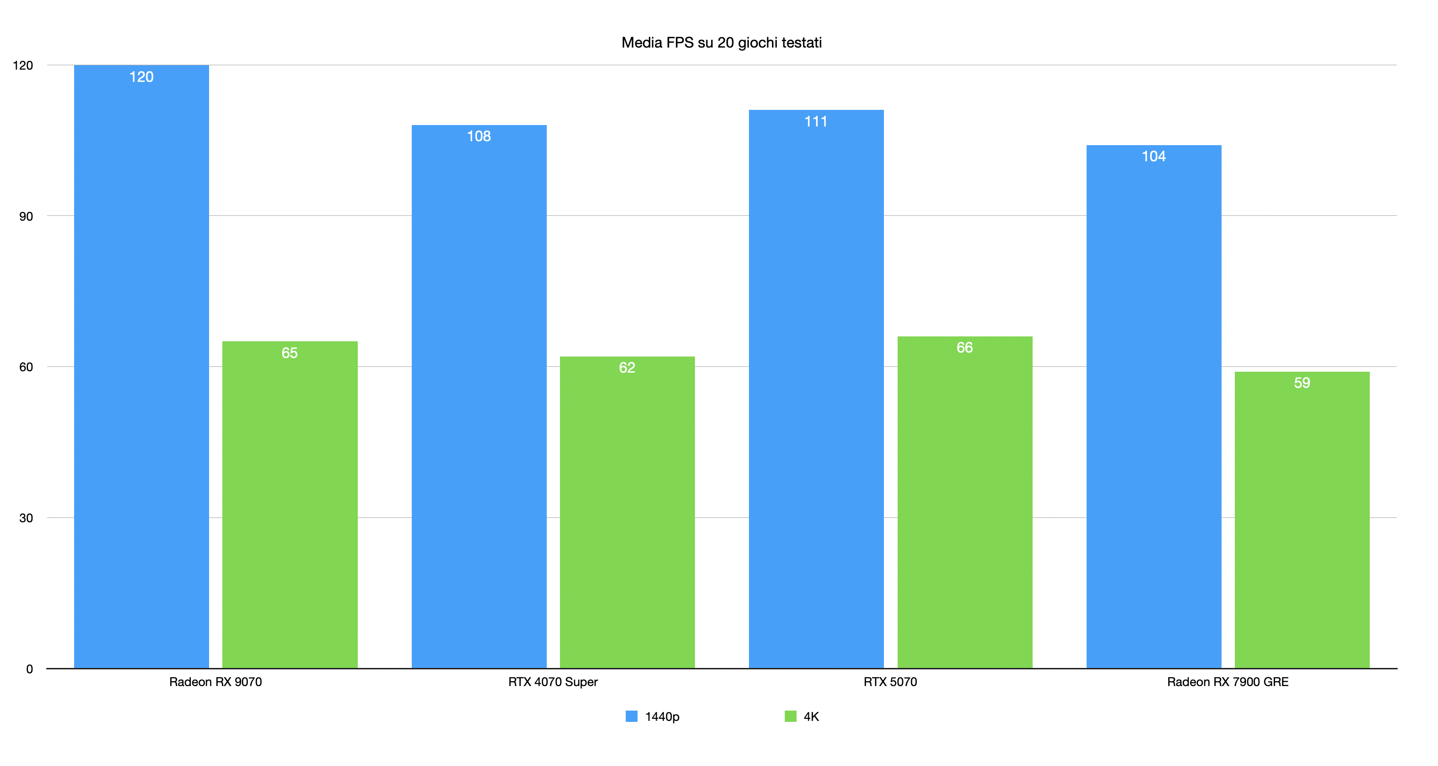 Guardando i dati complessivi testao più titoli e facendo una media generalizzata la RX 9070 è in media +22% più veloce della RX 7900 GRE e +22% più veloce della RTX 4070 Super / 5070 a 4K. A 1440p, il gap aumenta, con un +21% sulla 7900 GRE e un +20% sulla 4070 Super / 5070.