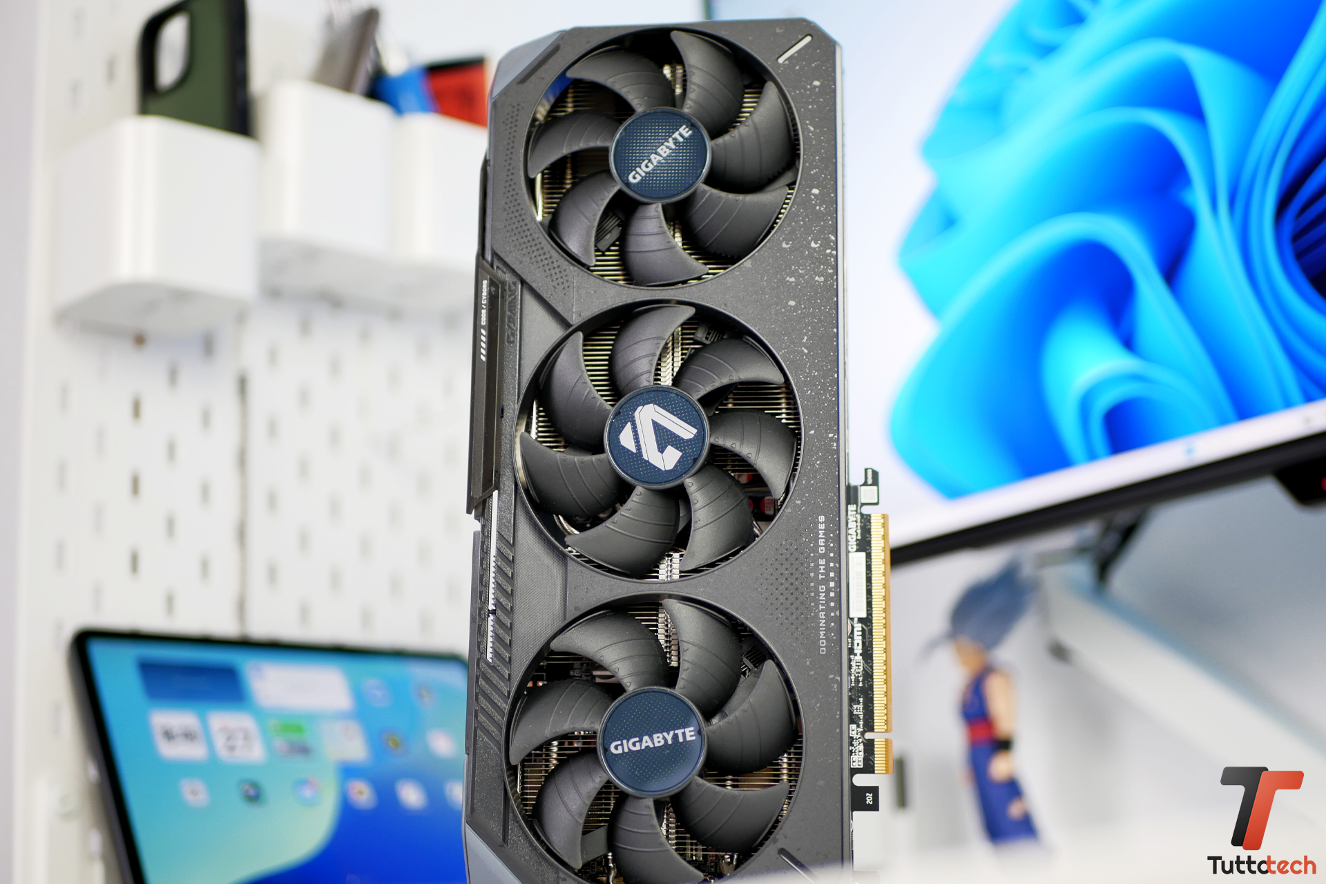 L’illuminazione RGB discreta, elegante, con il logo Gigabyte in evidenza, completa il quadro. Un tocco di personalizzazione che non sovrasta il design, ma lo esalta, tutto sincronizzabile via Gigabyte Control Center. E c’è anche un dettaglio per gli amanti delle build curate: la Sliding Side Plate, una copertura laterale regolabile per integrare la scheda nel proprio sistema con un look sempre pulito.