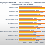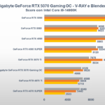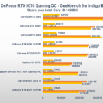Venendo ai benchmark relativi alla potenza di calcolo, AI e rendering, notiamo subito che la GeForce RTX 5070 eguaglia una GeForce RTX 4070 Ti nel test V-Ray e in Blender, risultando superiore a una Radeon RX 9070 su Geekbench 6 e Indigo, ma rimanendo dietro quest’ultima nella prova relativa a Geekbench AI.