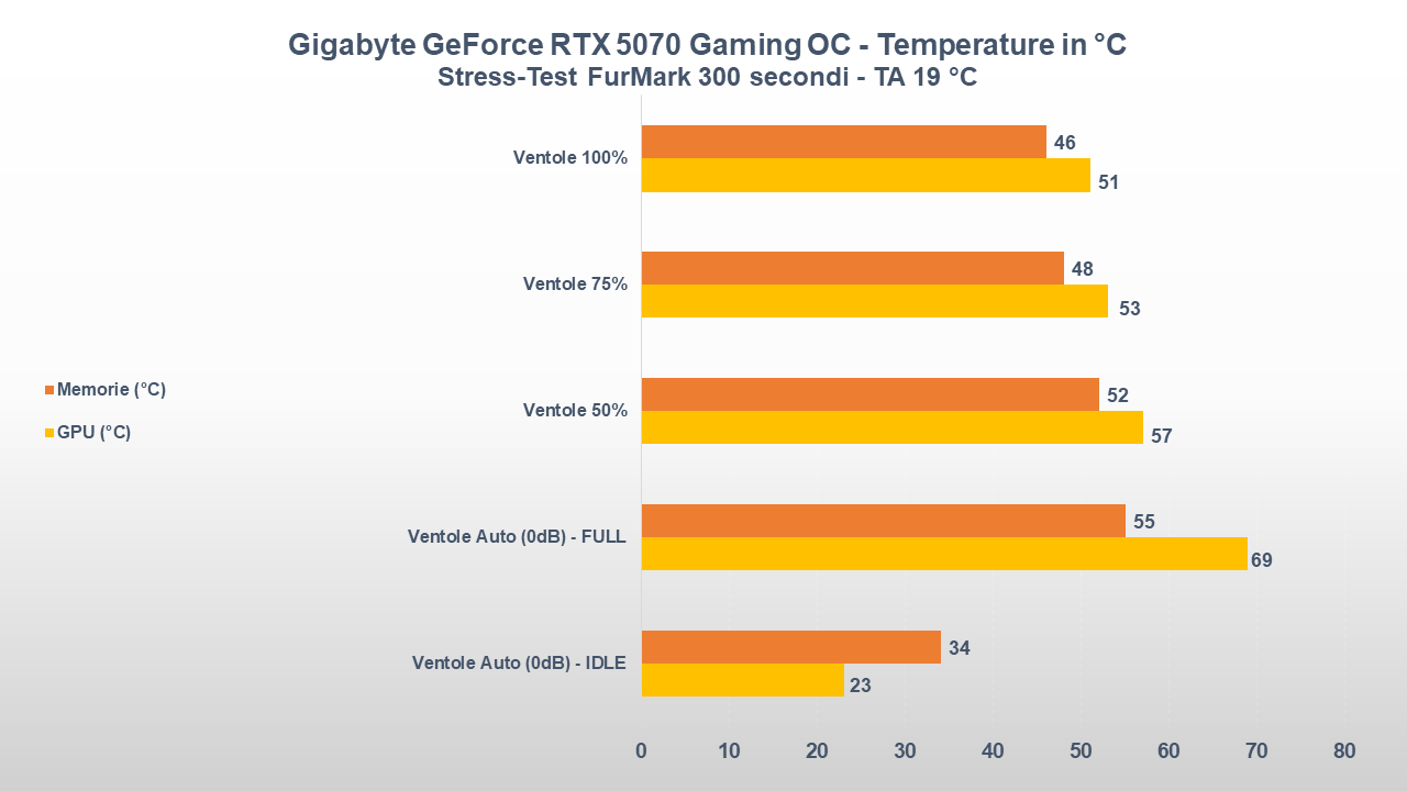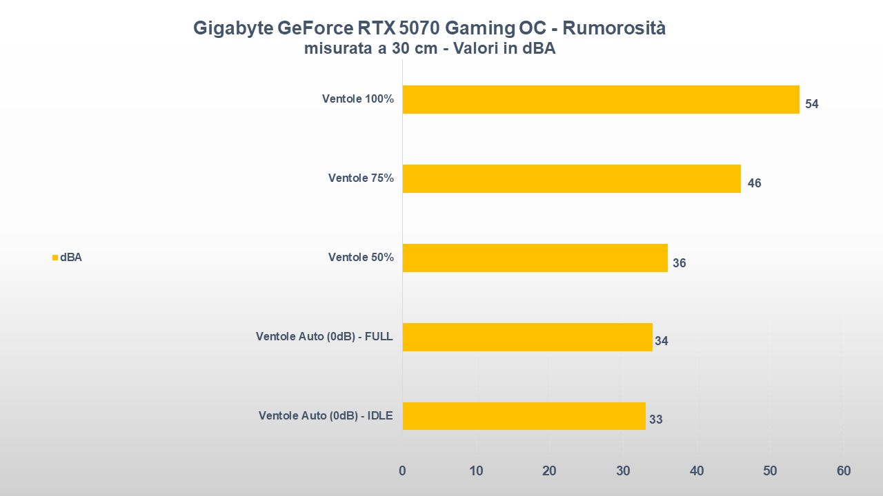 Alle prese con lo stress-test di FurMark, la Gigabyte GeForce RTX 5070 Gaming OC riesce a stabilizzarsi sotto i 60 °C già con ventole al 50%, valore che consigliamo visto anche il rumore prodotto a tale regime. La differenza tra ventole impostate al 50% e al 75% si fa sentire, ma per 10 dBA di rumore si può tranquillamente sacrificare qualche grado sui chip. Anche i consumi sono in piena regola; il picco registrato sotto carico coincide coi dati NVIDIA (250 watt), mentre ci riserviamo di condurre una sessione a parte per i consumi della scheda nel gaming.