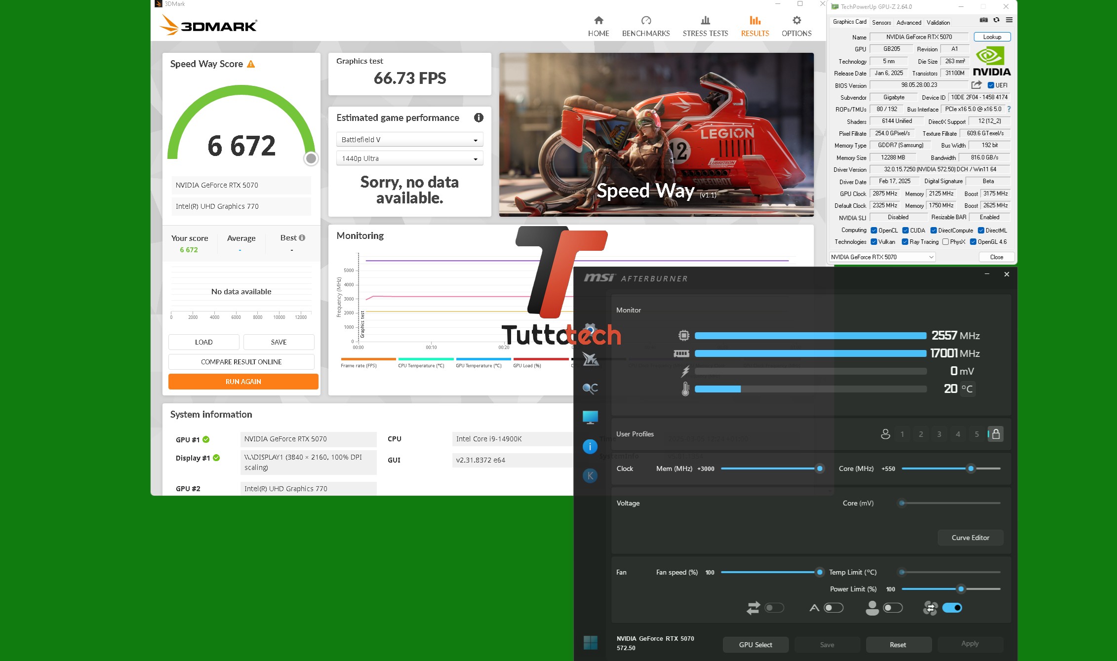 Senza modificare i parametri di potenza, la GPU Gigabyte mostra un potenziale a dir poco impressionante, garantendo un incremento della frequenza di clock nell’ordine di 500 MHz (che sono tanti). Sicuramente il TBP così contenuto può aiutare, mentre parlando di overclock “limite” il nostro risultato migliore ha visto la Gigabyte GeForce RTX 5070 Gaming OC spingersi a +550 MHz sulla GPU e ben 6 Gbps sulle memorie GDDR7 (ovvero 34 Gbps).