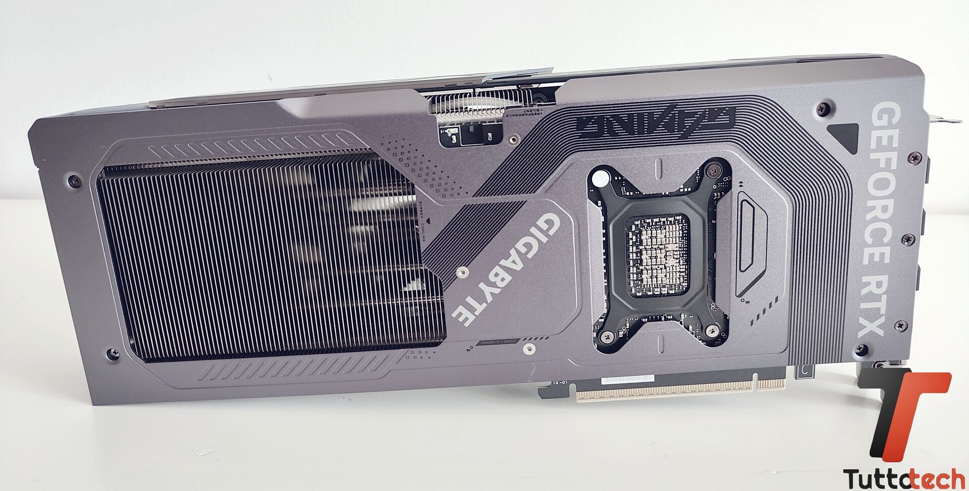 L’estetica (della cover s’intende) come detto è molto simile alla GeForce RTX 5070 Ti Gaming OC, davvero niente male col nuovo approccio che Gigabyte definisce multi-strato e con un effetto di solidità conferito senza dubbio dalla struttura rinforzata del telaio. Altri accorgimenti comuni alla RTX 5070 Ti che abbiamo rilevato sono il gel conduttivo in luogo dei classici pad termici per VRM e memorie, il Dual-BIOS e, non per ultimo, il Power Indicator che segnala anomalie sul connettore di alimentazione con tanto di led.
