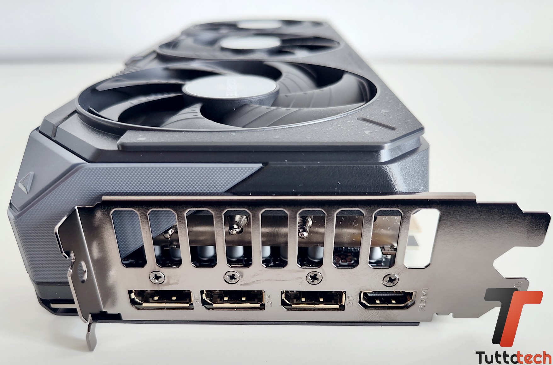 L’alimentazione ausiliaria della scheda è affidata al solito connettore PCI-E 16pin; non sappiamo se visto il TBP arriveranno anche modelli col classico connettore PCI-E 8pin (non sarebbe male), mentre per quanto concerne l’output video avremo a disposizione tre Display Port 2.1b e una HDMI 2.1a.