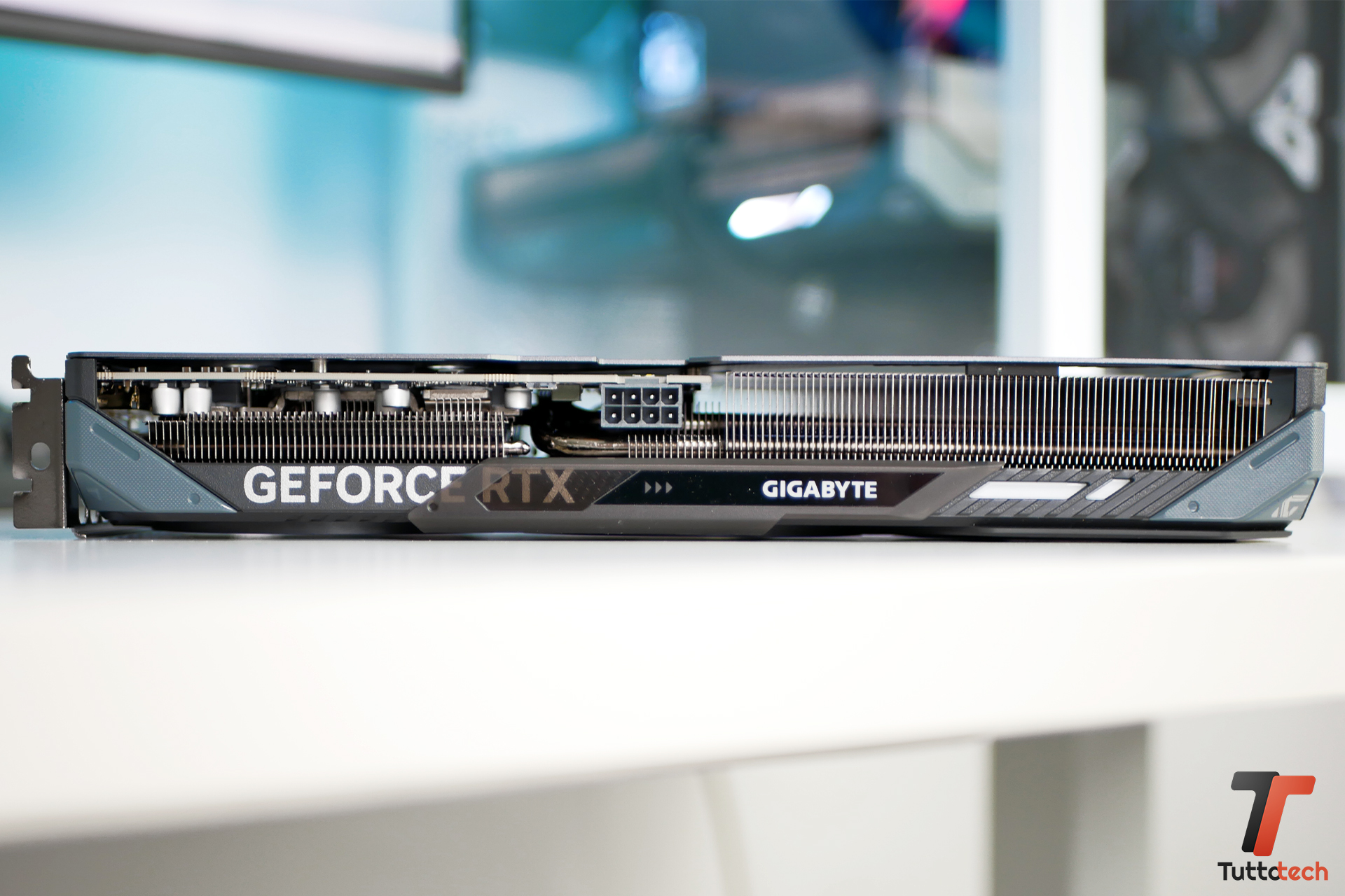 Il sistema di raffreddamento è affidato alla collaudata soluzione WindForce a tre ventole, in questo caso le Hawk, dotate di pale ad alta efficienza con rotazione alternata per ridurre la turbolenza. Il corpo dissipante è strutturato attorno a una base in rame nichelato che copre GPU e memorie, con heatpipe in rame che attraversano un generoso corpo lamellare. La parte posteriore è coperta da un backplate in metallo che contribuisce alla rigidità strutturale e ospita lo Screen Cooling, una finestra aperta che migliora lo smaltimento dell’aria calda attraverso il PCB. Nel complesso, si tratta di una custom ben bilanciata, capace di coniugare compattezza, buona efficienza termica e un impatto visivo pulito, ideale per chi cerca una GPU solida e versatile, pronta a integrarsi con discrezione in qualsiasi build moderna.