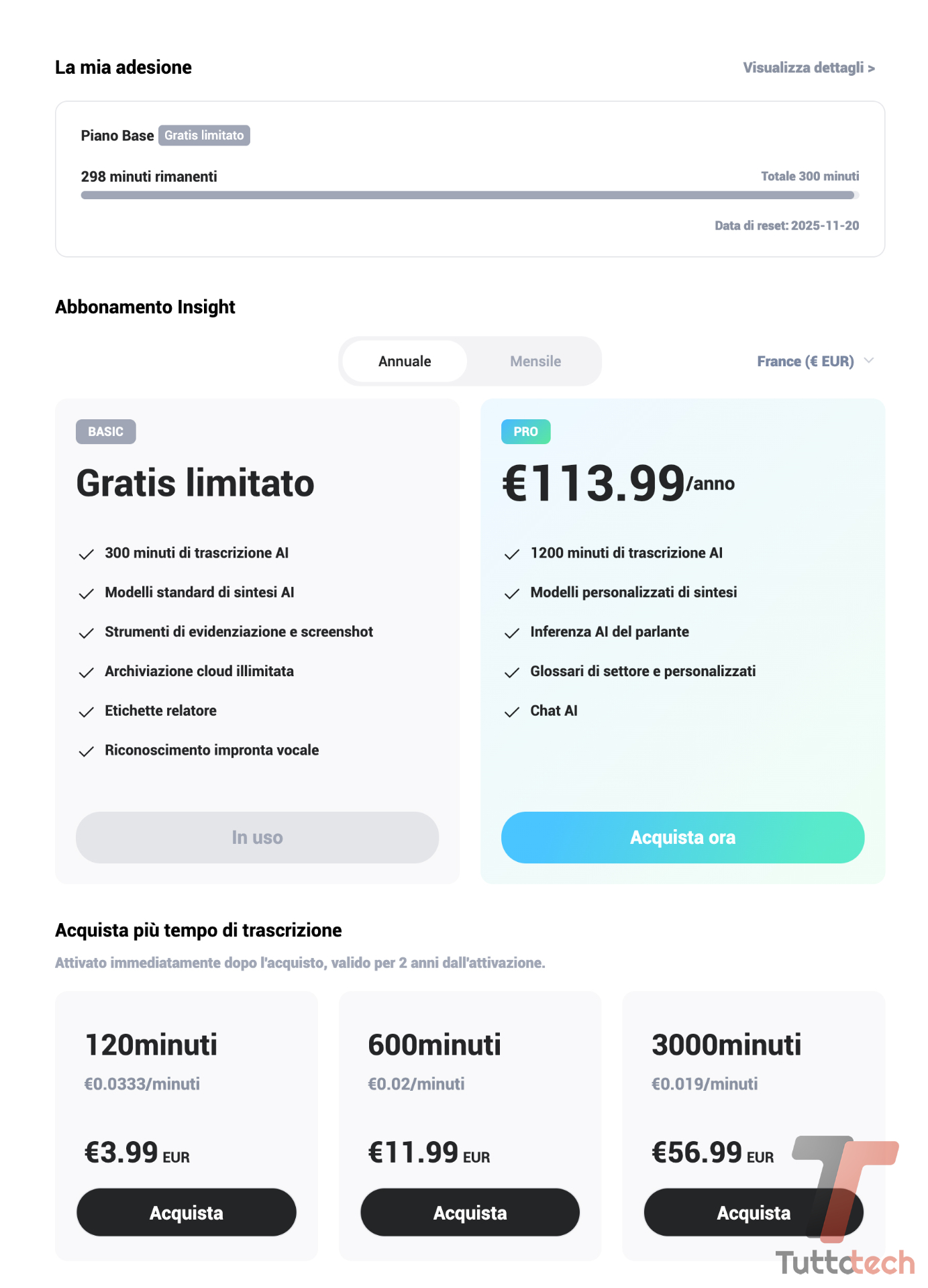 Se si preferisce la privacy, si può scegliere un salvataggio locale e offline, mentre il cloud offre condivisione facile tramite link o QR code con validità settimanale. L’abbonamento AI è molto competitivo rispetto ai competitor: si parte da un piano gratuito fino a 300 minuti al mese, mentre la versione Pro include 1200 minuti e strumenti avanzati.