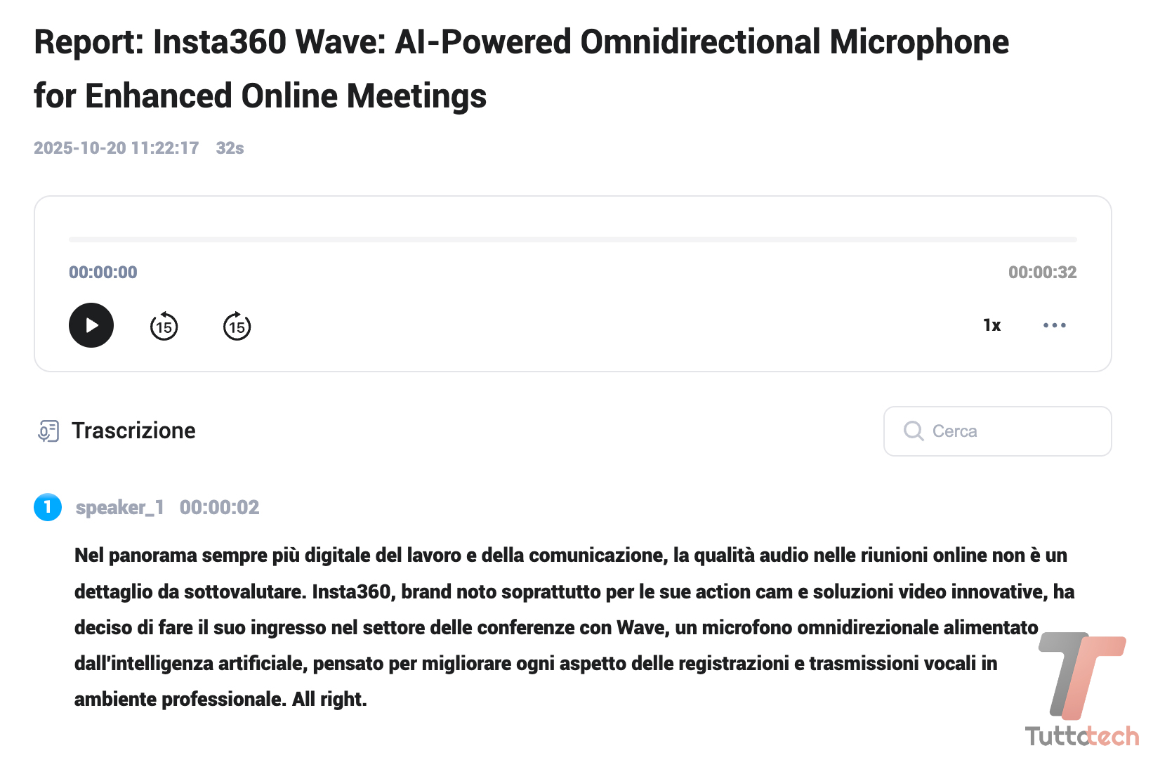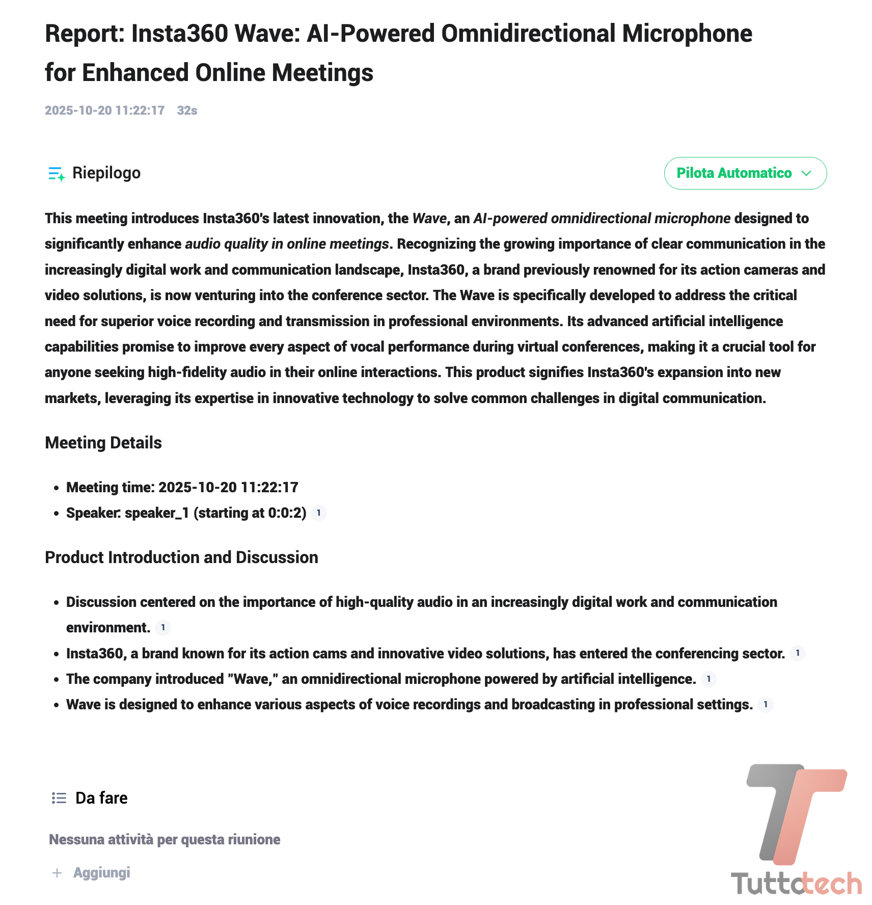 Dove la Insta360 Wave fa un vero salto generazionale è nel connubio con la suite AI Insta360 InSight. Trascrive le conversazioni all’istante, suddivide gli speaker, riconosce accenti e offre un glossario personalizzabile per adattare la trascrizione a termini tecnici. La generazione automatica di riepiloghi, liste di task e timeline è sorprendentemente rapida e accurata, un grande aiuto per chi gestisce meeting complessi e vuole risparmiare tempo.