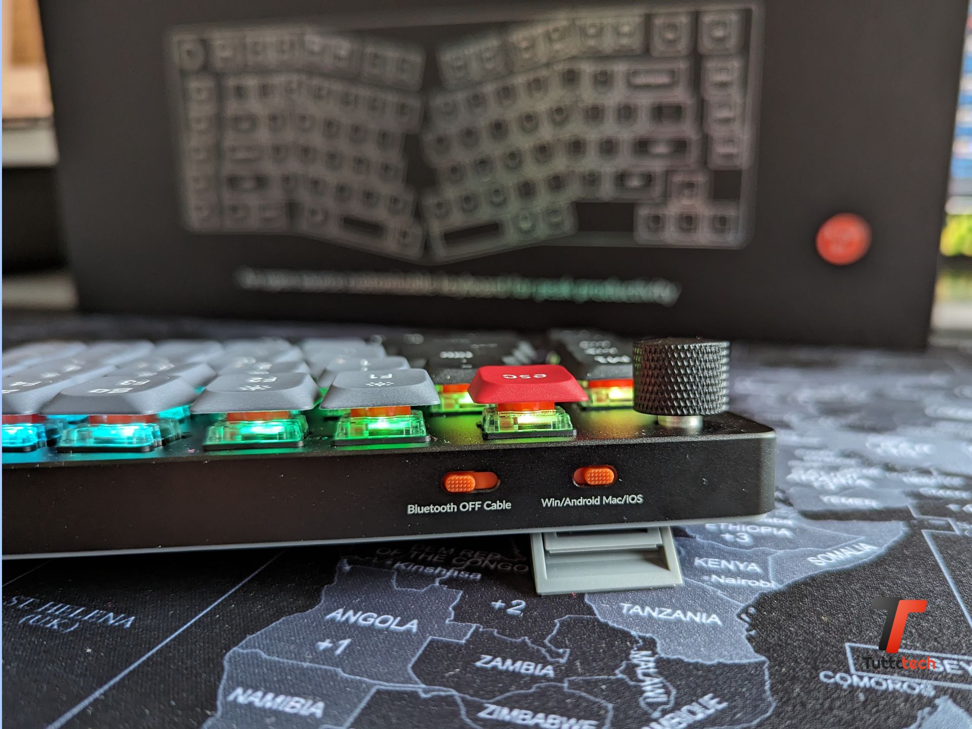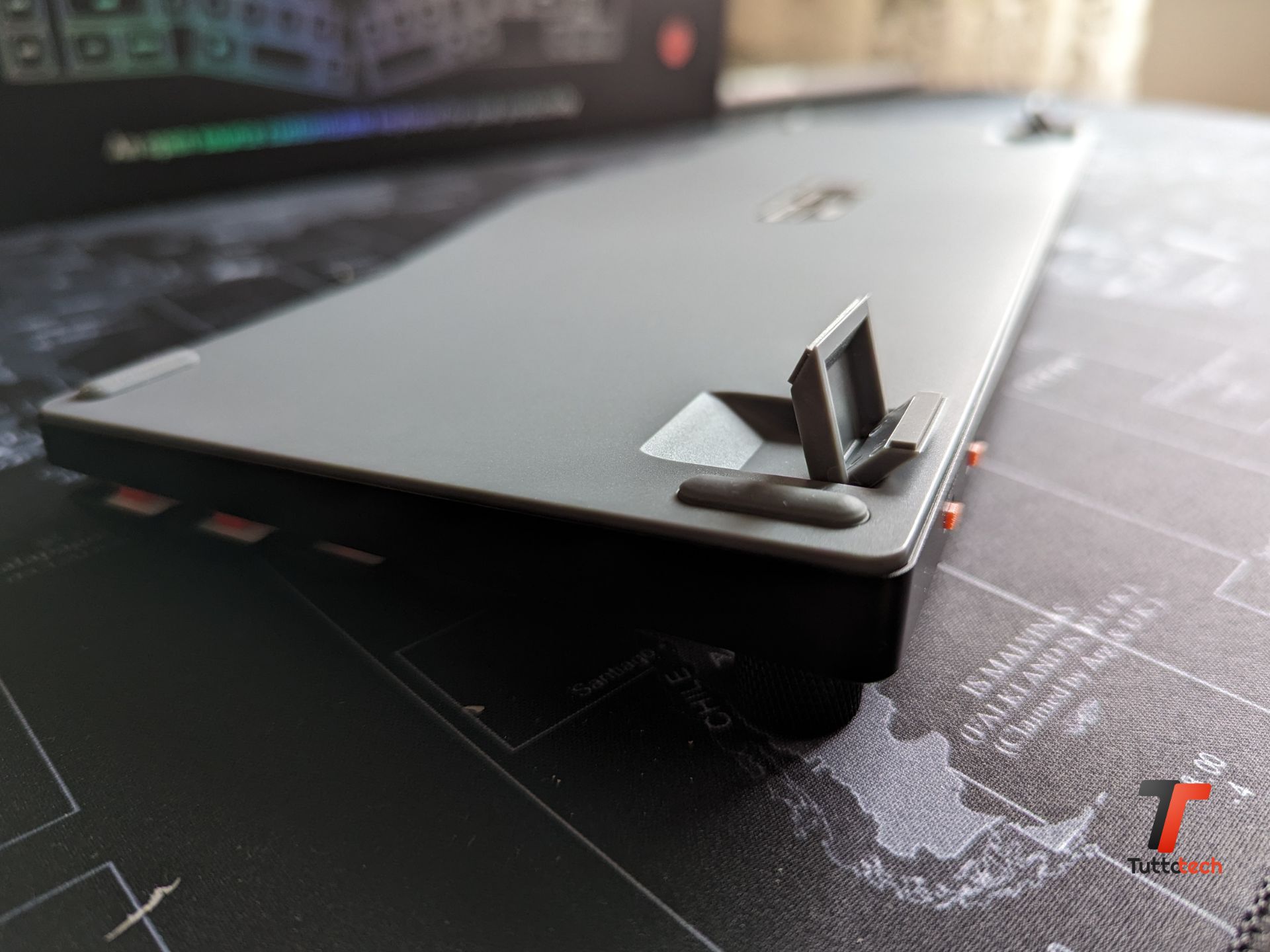 Molto utile la rotella accanto al tasto “esc” che, di serie, permette di regolare il volume ruotandola o di disattivarlo premendola. Coi due piedini alla base si possono invece scegliere fra tre diverse inclinazioni; l’inclinazione naturale è appena accennata considerando la differenza fra i 21,3 mm dell’altezza misurata all’estremità superiore della prima fila dei tasti e i 29 mm della fila dei tasti funzione.