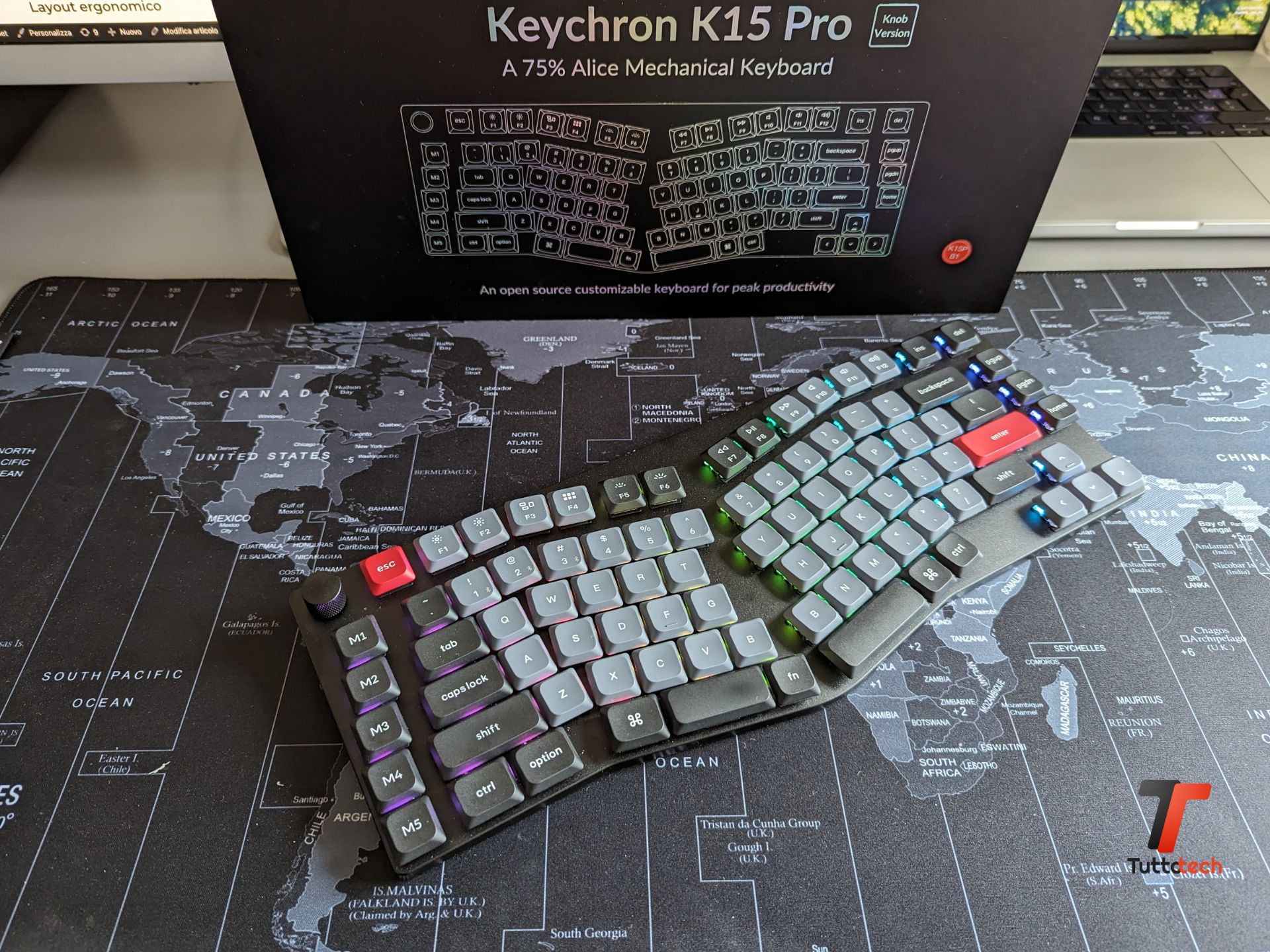 Passare a una tastiera meccanica dopo aver usato per diversi mesi tastiere a membrana di qualità, come la Logitech Mx Keys S e quella montata sugli ultimi MacBook Pro, è un’esperienza particolare, non proprio indolore, soprattutto per chi scrive molto ogni giorno. Con la Keychron K15 Pro in prova, ha contribuito a rendere difficoltoso il passaggio anche il layout ergonomico, oltre che non italiano; viceversa gli switch a basso profilo, con una corsa e un’altezza molto contenute, hanno limitato di un po’ i doverosi adattamenti. Dopo circa tre settimane di utilizzo pressoché quotidiano, è tempo di tirare le somme.