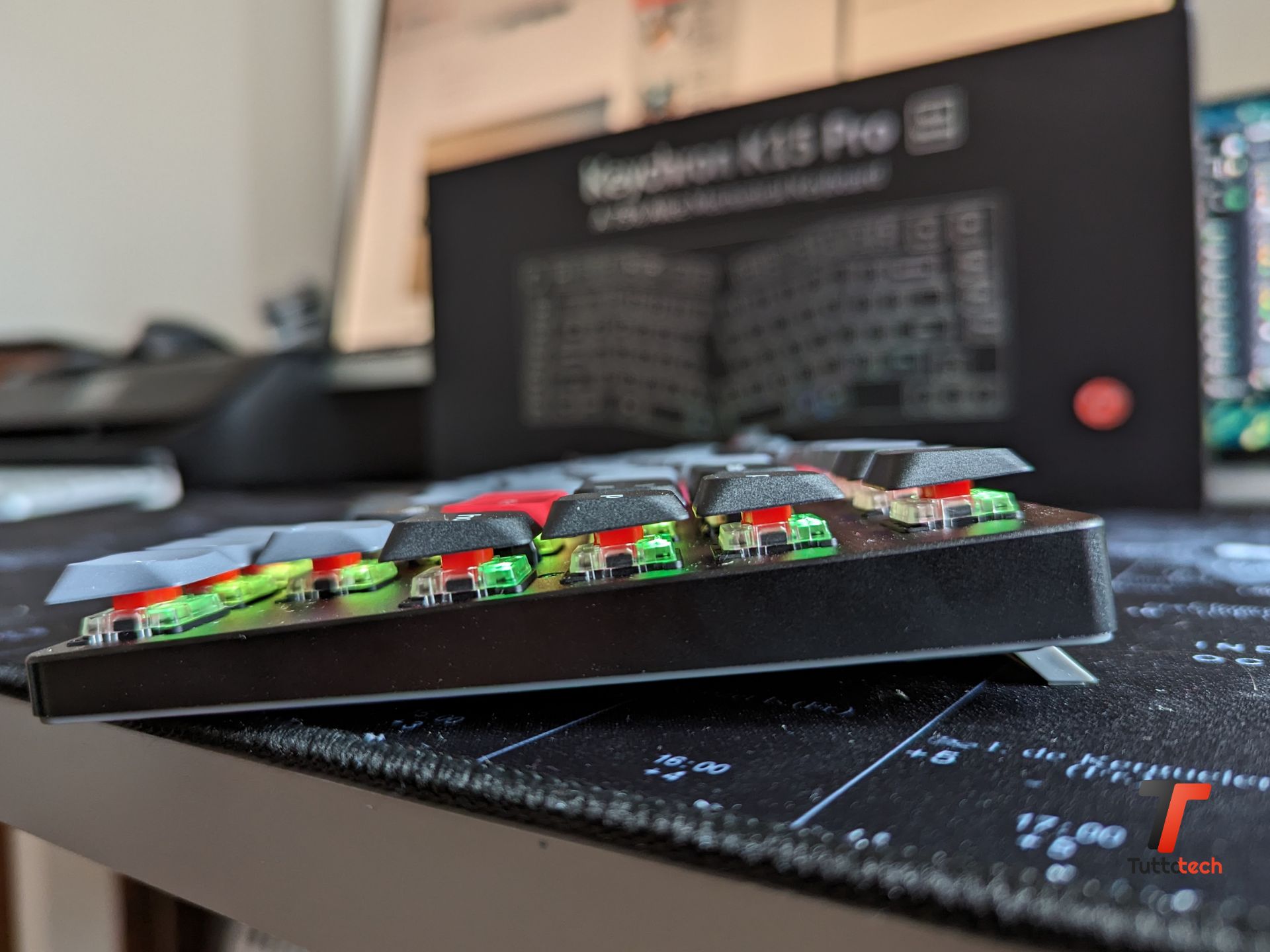 La Keychron K15 Pro che abbiamo provato è dotata di un sistema di retroilluminazione RGB, ma c’è anche la versione con retroilluminazione bianca a qualche euro in meno. È possibile scegliere fra 22 tipi di modalità di illuminazione fra statiche e dinamiche, personalizzabili sia in intensità che in velocità di transizione tramite scorciatoie. Il problema, decisamente rilevante, è che i tasti non sono trasparenti, cioè la luce non passa, il che rende la stessa retroilluminazione pressoché inutile, una mera questione estetica. Perché al calar del sole, senza una fonte di luce decente (il monitor non basta se lo si tiene a livelli accettabili per l’utilizzo a luci spente), è quasi impossibile distinguere i tasti, con la retroilluminazione di serie che circonda i keycaps invece di renderli distinguibili. Un peccato.
