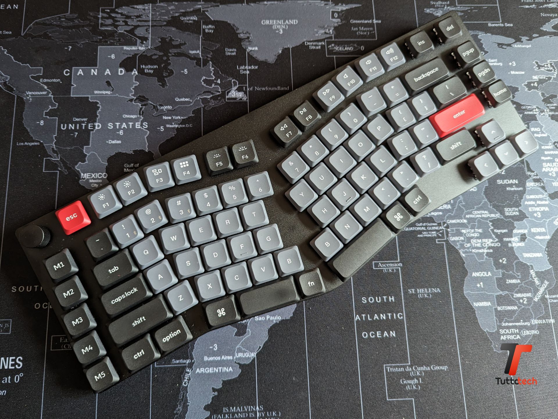 K15 Pro è uno dei più recenti prodotti di Keychron, un’azienda di tastiere nata nel 2017 che si sta ritagliando uno spazio sempre più importante nel mercato. Quella che abbiamo provato è una tastiera 75% (89 tasti) a basso profilo con layout Alice, particolarità che contraddistingue diversi prodotti del produttore (e non solo). Si tratta di una disposizione dei tasti a forma di “V”aperta, pensata per rendere più ergonomica la digitazione in accordo con la posizione naturale che assumono le mani. Come si evince dalle immagini, a parte lo spazio verticale al centro, che ne divide a metà i tasti, è curioso notare la doppia “B” e lo sdoppiamento della barra spaziatrice con in mezzo il tasto “fn”.