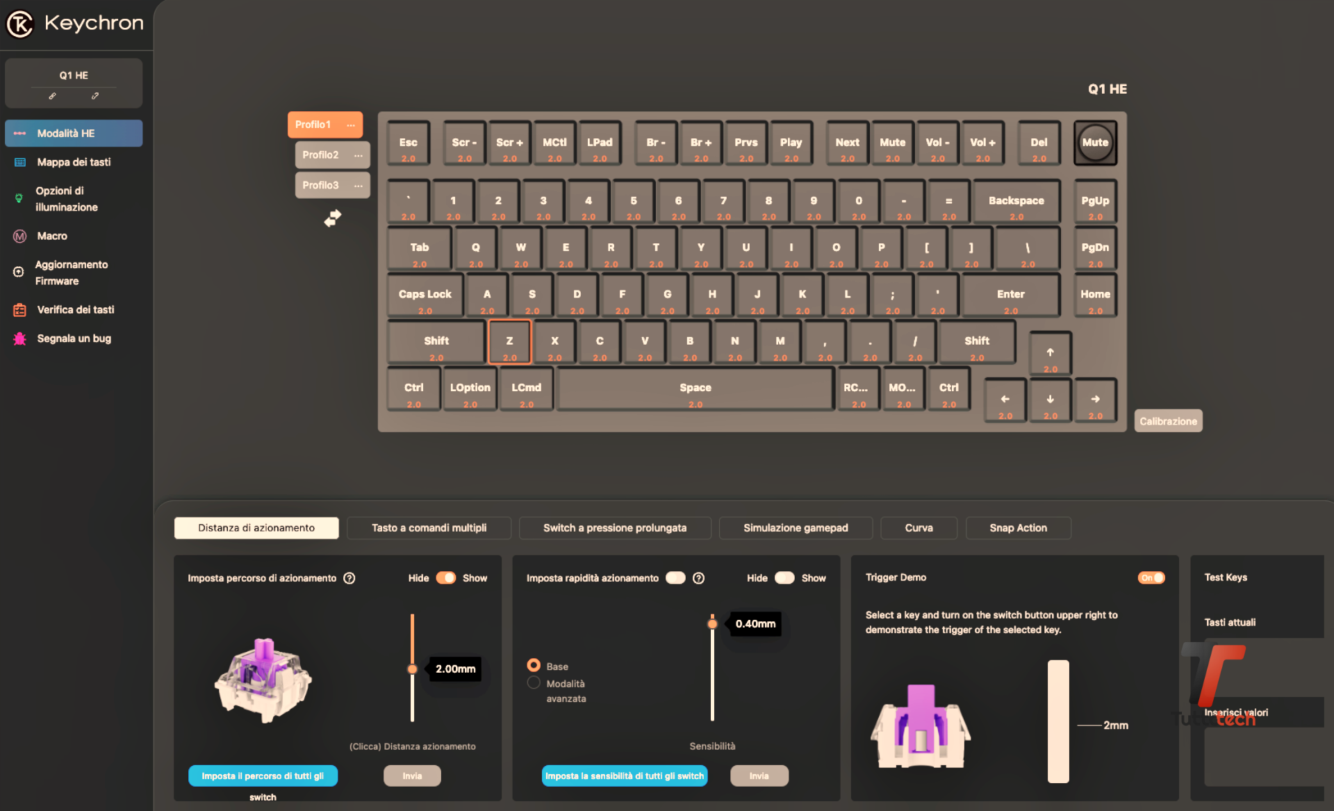 Come buona parte delle tastiere Keychron, anche questa Q1 HE può contare su un firmware QMK che significa infinite possibilità di personalizzazione, creazione di macro e ovviamente rimappatura dei tasti, così da rendere la tastiera conforme alle vostre necessità. noi, ad esempio, abbiamo spostato la posizione del tasto Home e di quello End, raddoppiando anche il tasto Del che ha preso il posto dei tasto PgUp e PgDown. Per farlo abbiamo utilizzato un nuovo set di keycaps, così da avere tutto molto chiaro, ma è ovviamente possibile mantenere i keycap originali e ricordare l’assegnazione di ogni tasto. Questo significa, ad esempio, che potrete aggiungere i caratteri accentati, ma anche creare delle sequenze di comandi o delle macro semplicemente premendo un tasto. E potete gestire tre diversi profili, da attivare ad esempio prima di lanciare un gioco, così da avere le macro e determinati tasti solo quando giocate, con una configurazione più normale per la scrittura classica.