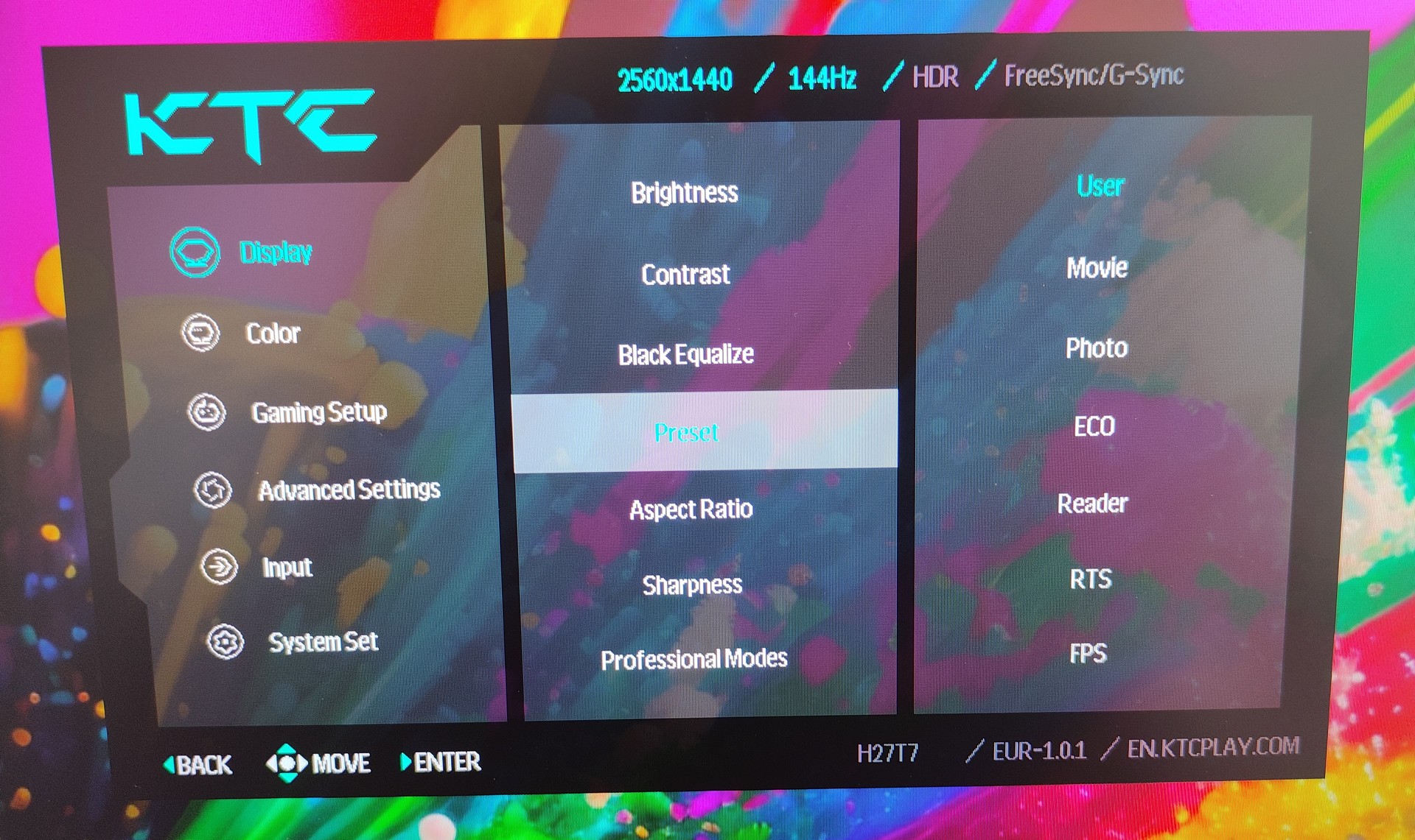 KTC ci dice che il monitor è calibrato di fabbrica, e anche qui forse entriamo nel soggettivo; secondo noi le impostazioni USER sono un po’ troppo conservative, quindi se non trovate un buon compromesso con i preset predefiniti (che comunque aiutano) potete mettere mano alle impostazioni come abbiamo fatto noi (alzando in primis la luminosità).