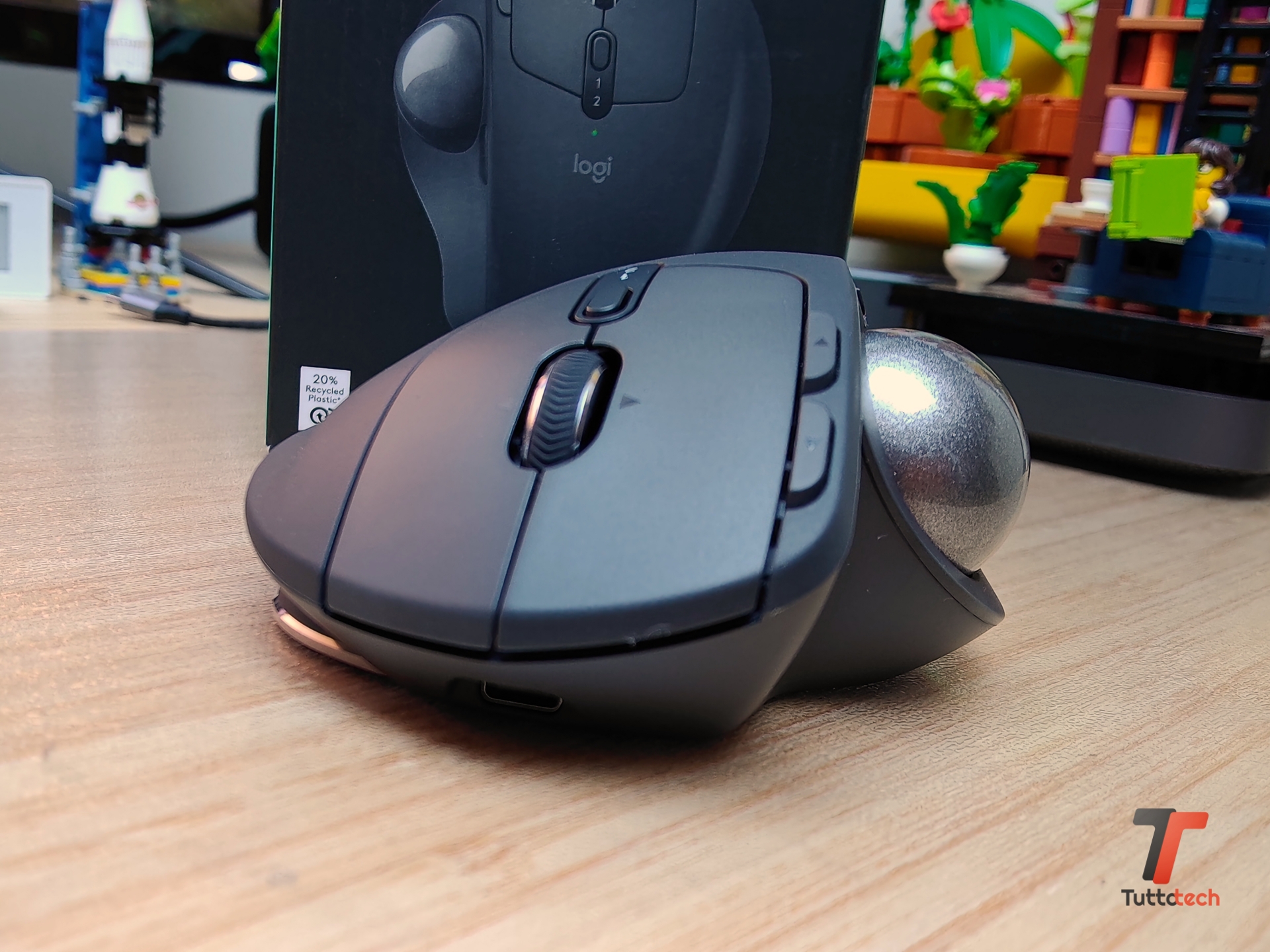 Come sempre Logitech ha pensato alla connettività, offrendo diverse opzioni, grazie anche alla presenza di una batteria interna ricaricabile. Non serve collegare la trackball al computer con un cavo (anche perché così perdereste in libertà di utilizzo) ma potete scegliere tra Bluetooth e wireless. Nella confezione di vendita è presente un ricevitore Logi Bolt da inserire in una porta USB-A del vostro computer, senza che sia necessaria alcuna configurazione. Noi lo abbiamo utilizzato prevalentemente con il Bluetooth su un Mac Mini e non abbiamo mai avuto problemi di connettività o di interferenze con altri dispositivi collegati contemporaneamente, come tastiera, cuffie e speaker.