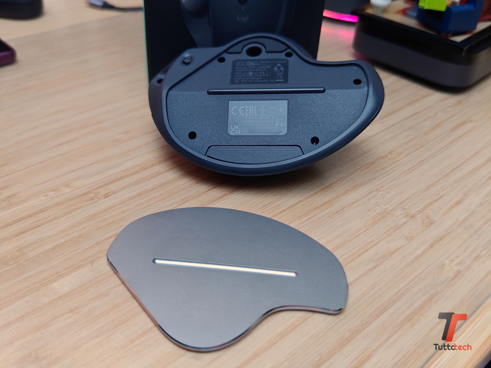 Ma come è riuscita Logitech a realizzare un dispositivo che può essere utilizzato con due inclinazioni, senza compromettere la stabilità? È sufficiente una base metallica, non particolarmente pesante, che si fissa magneticamente alla base della trackball, con una scanalatura per essere certi di posizionarla correttamente. Nella parte inferiore della base è presente un rivestimento in gomma che garantisce un’ottima stabilità su qualsiasi superficie, anche su un tappetino da scrivania particolarmente scivoloso come quello che utilizziamo noi. Basta una pressione verso l’interno o l’esterno per ruotare la trackball, abbastanza decisa da evitare movimenti involontari durante l’utilizzo. Se non doveste trovarvi con l’inclinazione verso l’esterno potrete sempre utilizzarla “piatta” come una normale trackball, o ruotarla periodicamente per variare la posizione.