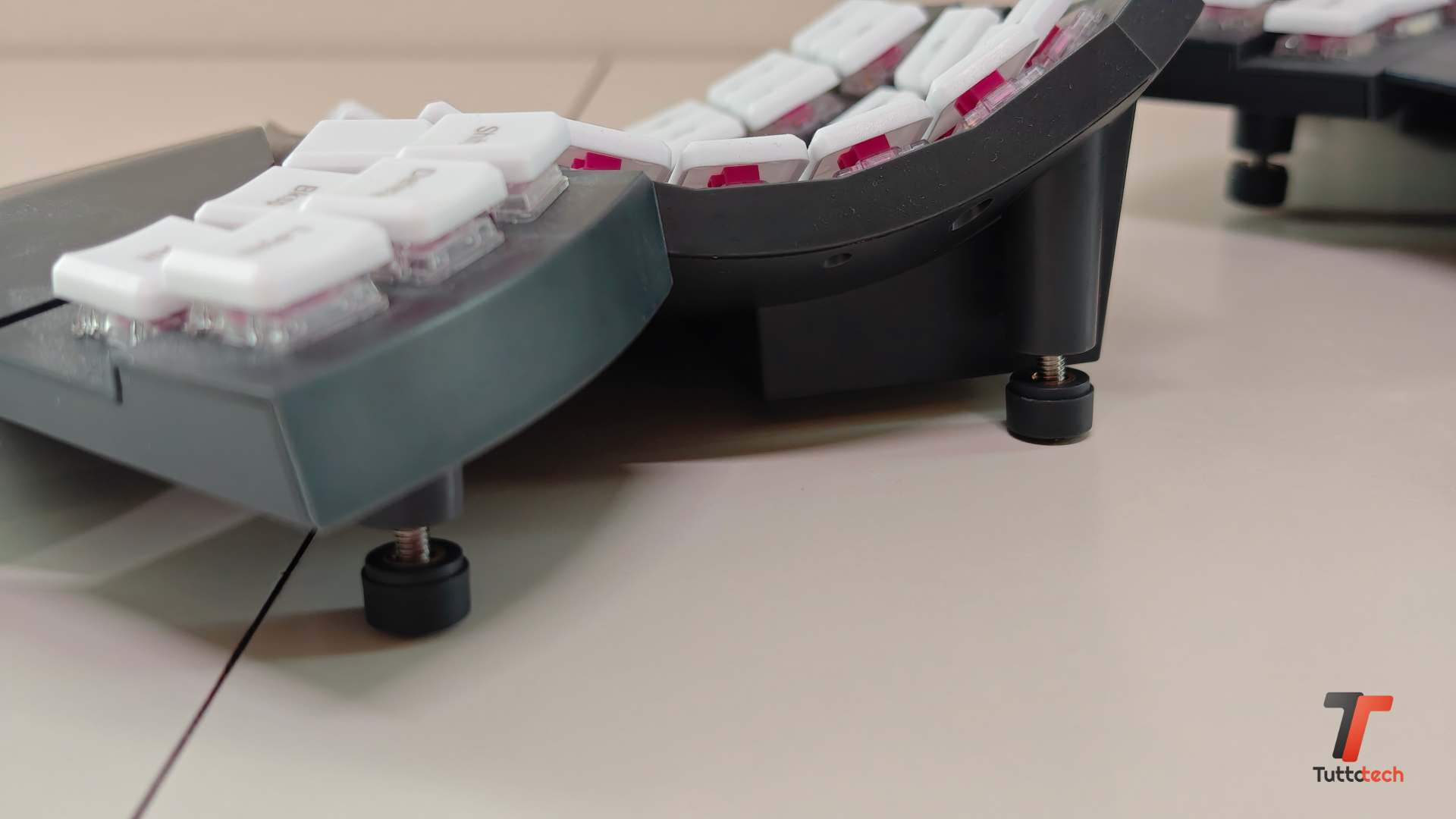 Tra gli accessori trovate una serie di “piedini” per regolare l’altezza e l’inclinazione della tastiera, piedini in gomma, viti, tasti bianchi e una serie di anelli in gomma per conferire una maggiore stabilità ai sostegni ed evitare scivolamenti durante l’uso. Grazie a tutti questi elementi potete cambiare l’inclinazione della tastiera, alzarne un lato o l’altro, cambiare l’inclinazione frontale, alzarla o abbassarla magari per adattarsi meglio ai braccioli ma c’è anche chi ja montato le due estremità direttamente sui braccioli della sedia, per avere una postazione da lavoro unica.