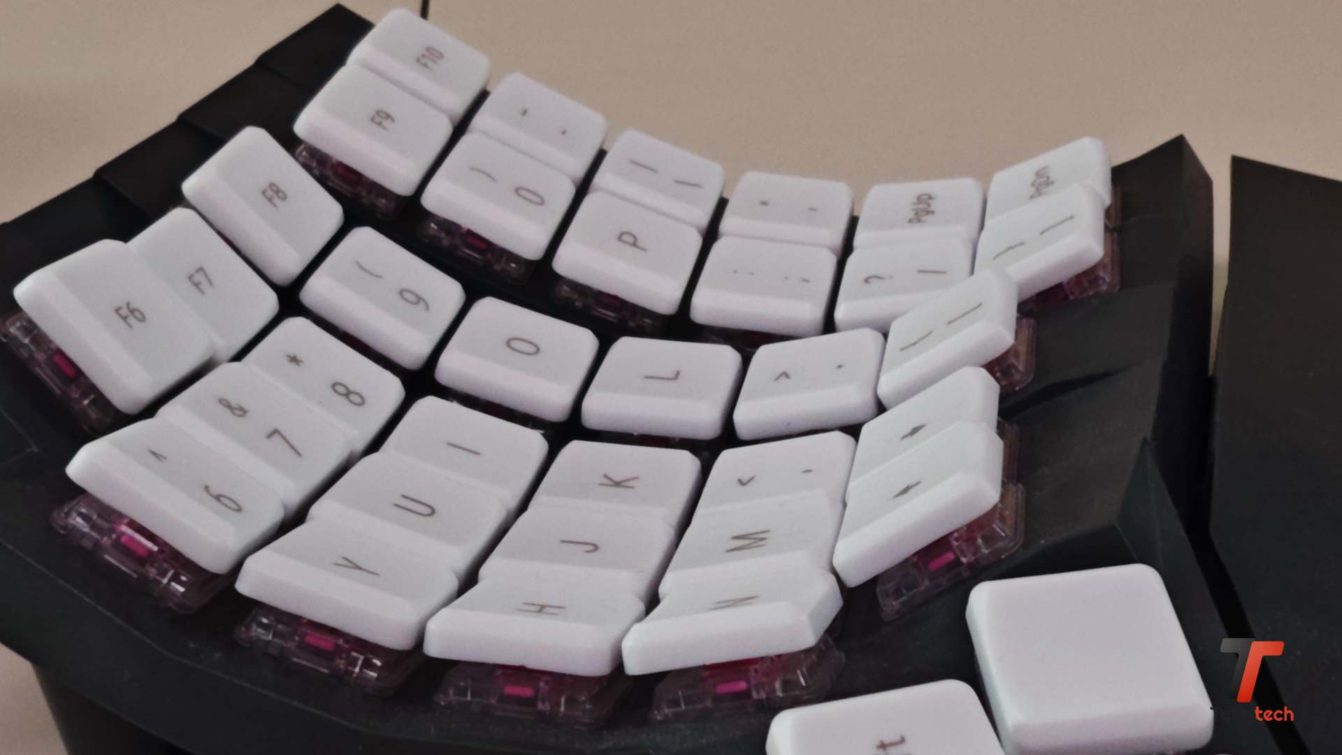 Se poi ci aggiungete che MoErgo Glove80 è una tastiera ortolineare, con tutti i tasti allineati a griglia e non sfalsati come su una tastiera normale, e che i tasti sono disposti su una sorta di pozzo, con i vari caratteri ad altezze leggermente diverse, risulta evidente come le variabili in gioco siano davvero tantissime e padroneggiare questa tastiera in maniera soddisfacente non sia proprio facile.