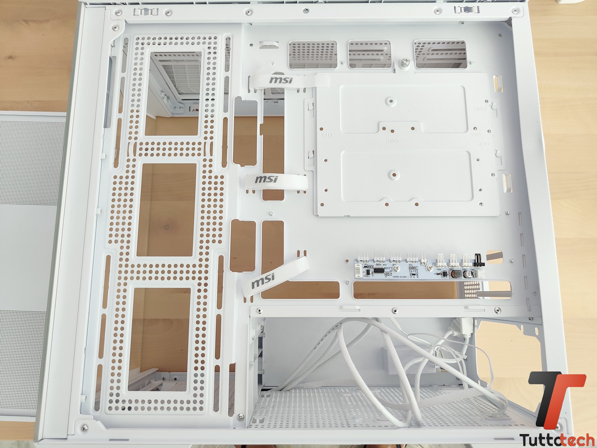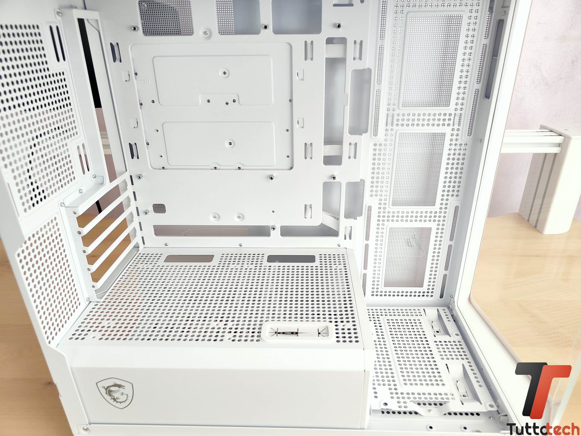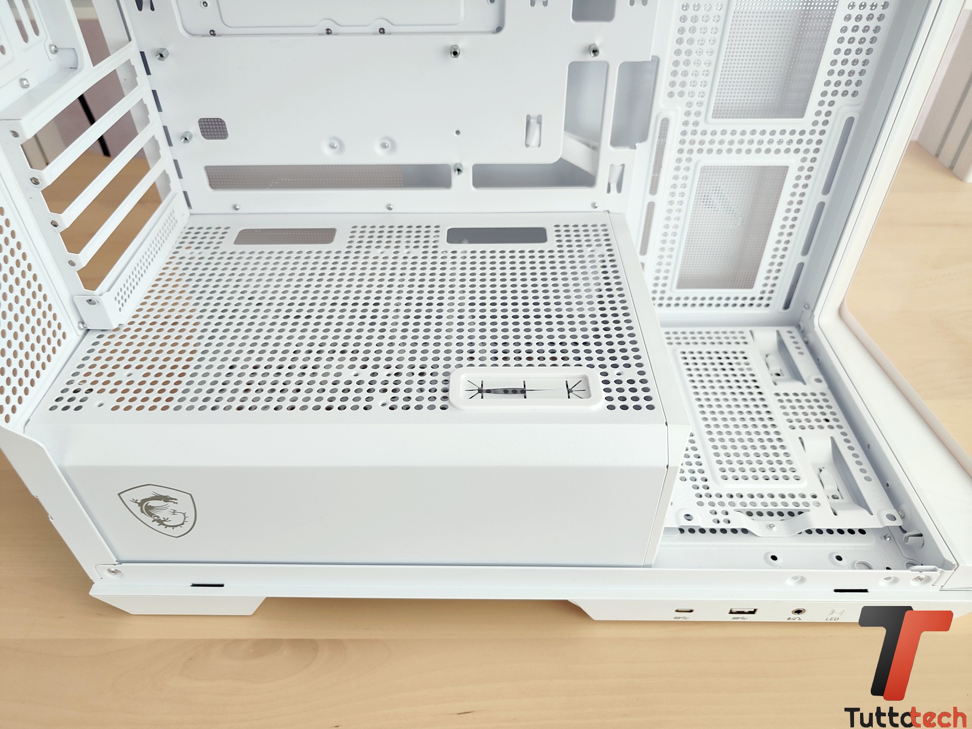 Questo tipo di design, abbinato tra l’altro a un vano alimentatore posto davanti e sotto la scheda madre, non permette alcune configurazioni in ottica airflow; ad esempio, non possiamo montare tre ventole da 120 sulla base in modo “classico” o sul frontale, ma in compenso MSI permette di posizionare tre ventole ARGB in immissione sulla parte laterale e una in espulsione sul retro, lasciando all’utente altre tre griglie per ventole da 120 mm (in totale quindi 10), due sul vano PSU e una sul frontale alla base.