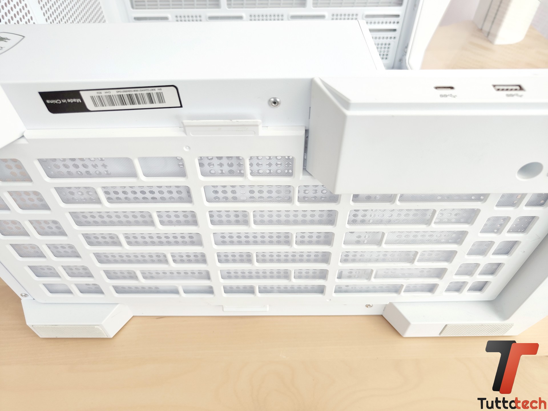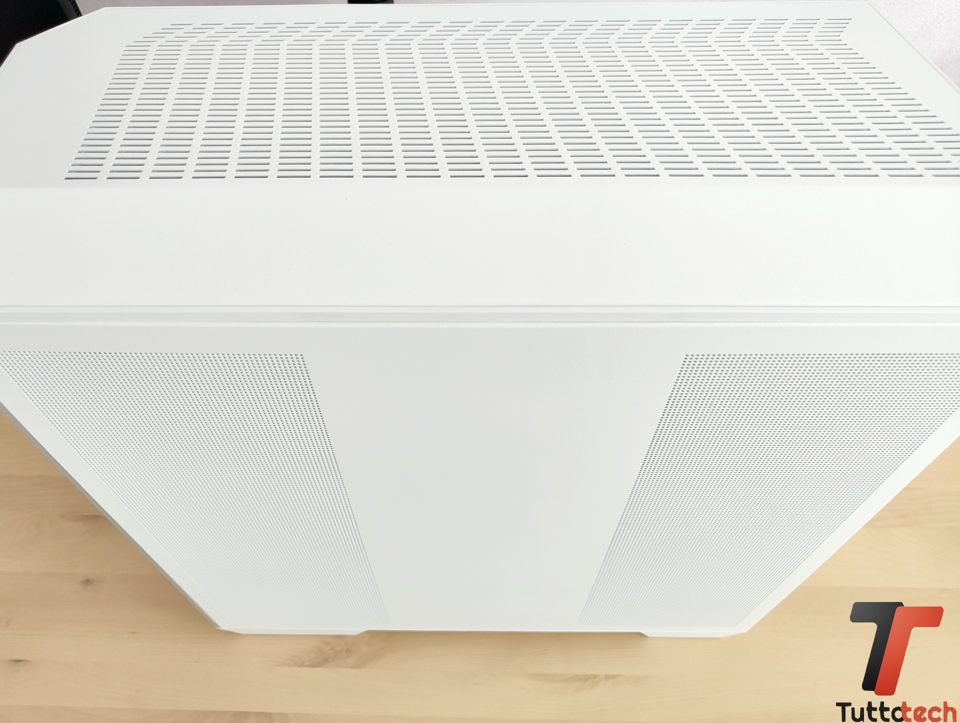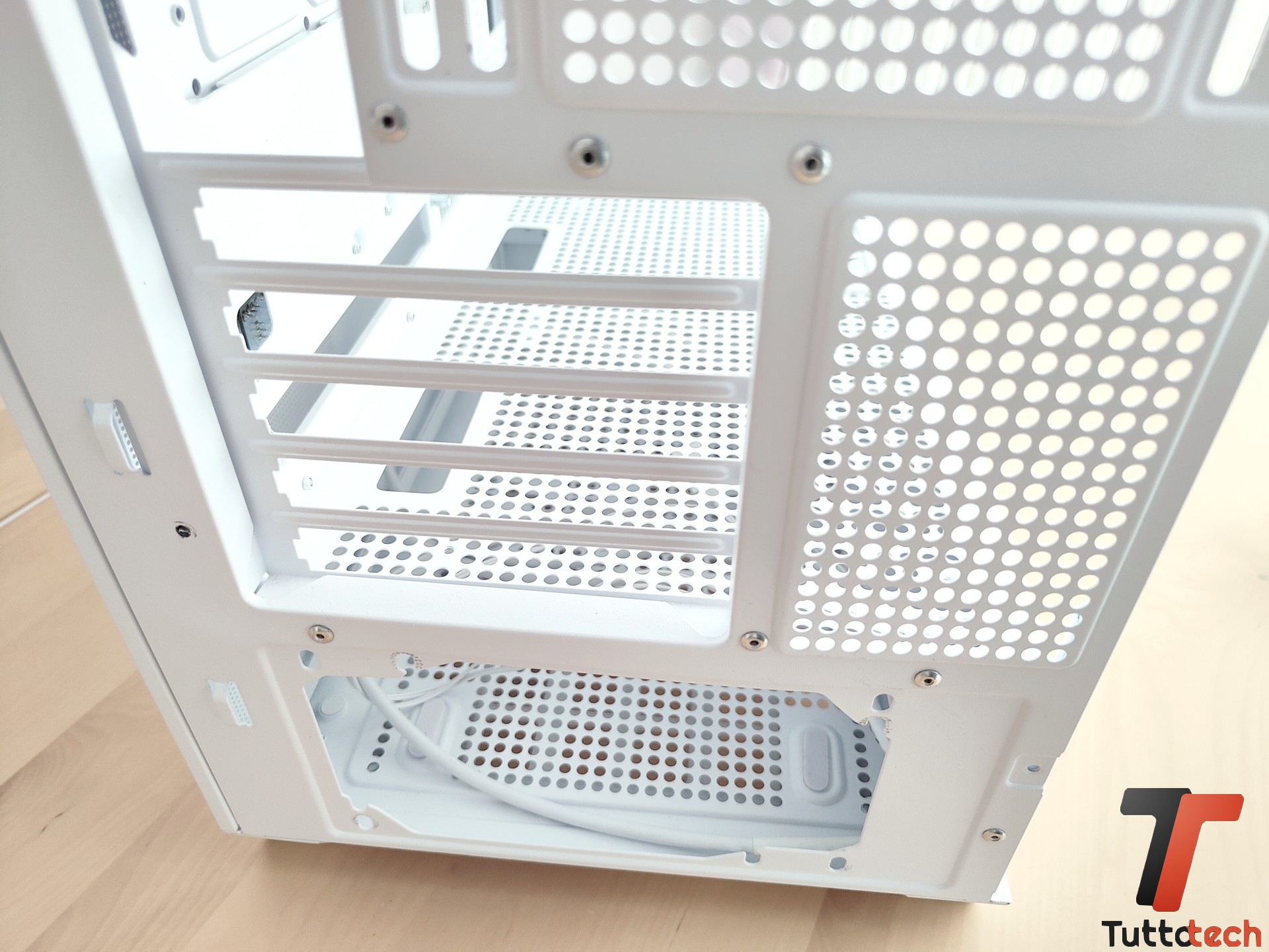 In primis segnaliamo un design ottimizzato per la gestione dei cavi, con guide da 33 mm e strisce in velcro per tenere tutto in ordine. Sulla base e sul top sono presenti invece due generosi filtri antipolvere, senza dimenticare una certa cura per il pannello I/O posto sul laterale, equipaggiato con una USB Type-A 5 Gbps, una USB-C 20 Gbps, audio in/out e pulsante led dedicato per gestire gli effetti luce con un click.