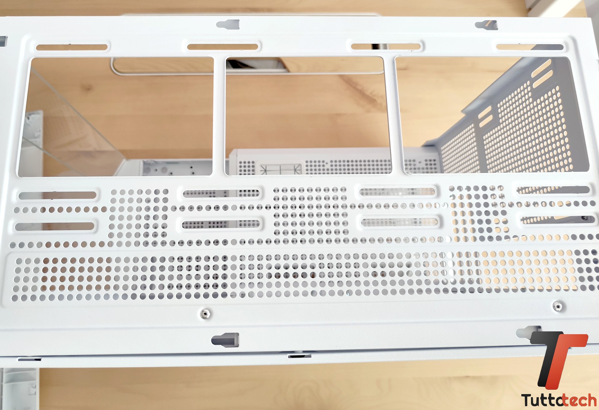 La nostra configurazione quindi risulta ovviamente avvantaggiata per quanto concerne il rumore prodotto, mentre l’assenza di ulteriori tre ventole in immissione, da installare sul laterale o sui vani ricavati dalla base, potrebbe penalizzare l’airflow e di conseguenza le temperature.
