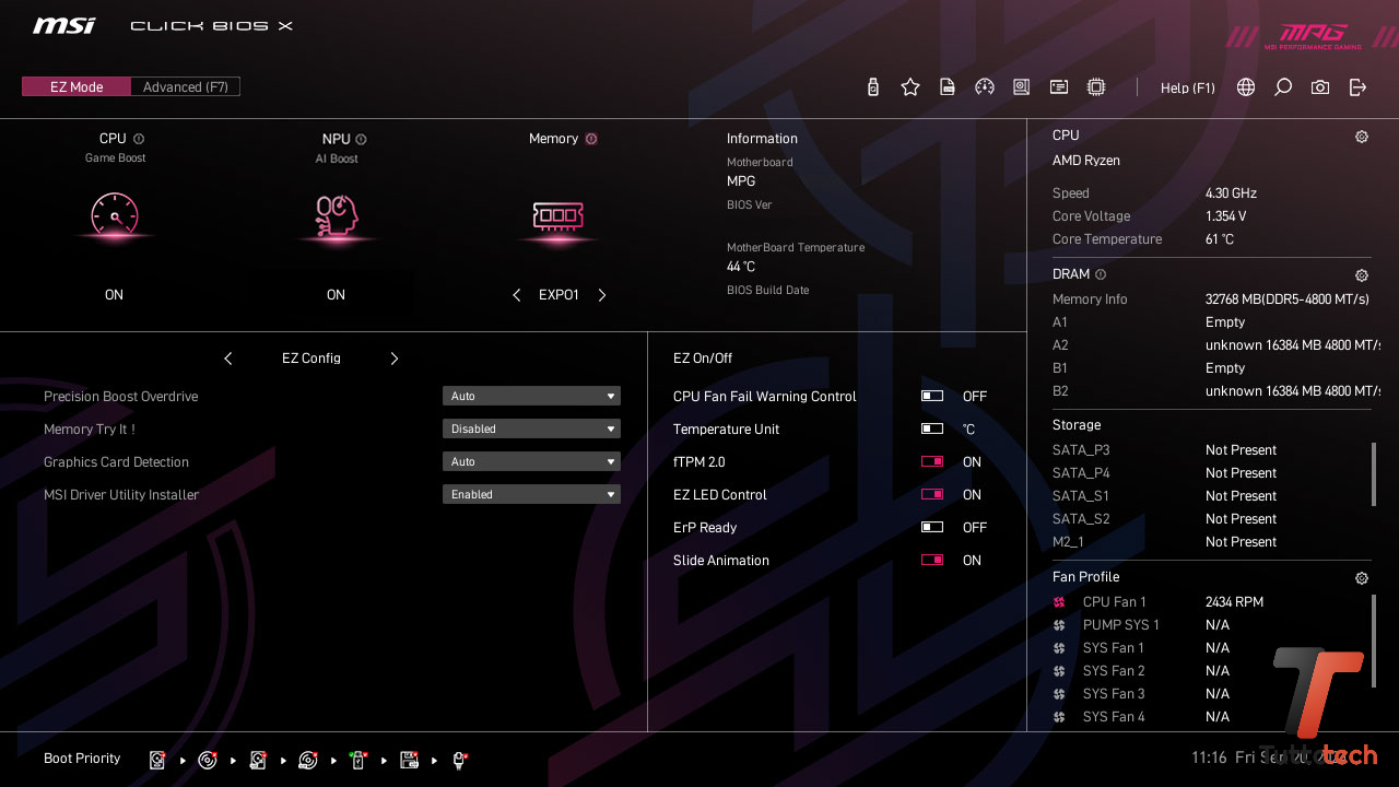Chiudendo questa panoramica proprio sul BIOS, a bordo troviamo l’ultima iterazione di CLICK BIOS X, altra nostra vecchia conoscenza che anche qui può essere utilizzato sia in modalità EZ che avanzata. Per i meno esperti che puntano a ottimizzare le prestazioni, in EZ Mode troviamo opzioni come CPU Game Boost, NPU AI Boost e modalità EXPO per le DDR5, ma se siete esperti la modalità avanzata sicuramente vi darà molte più soddisfazioni.